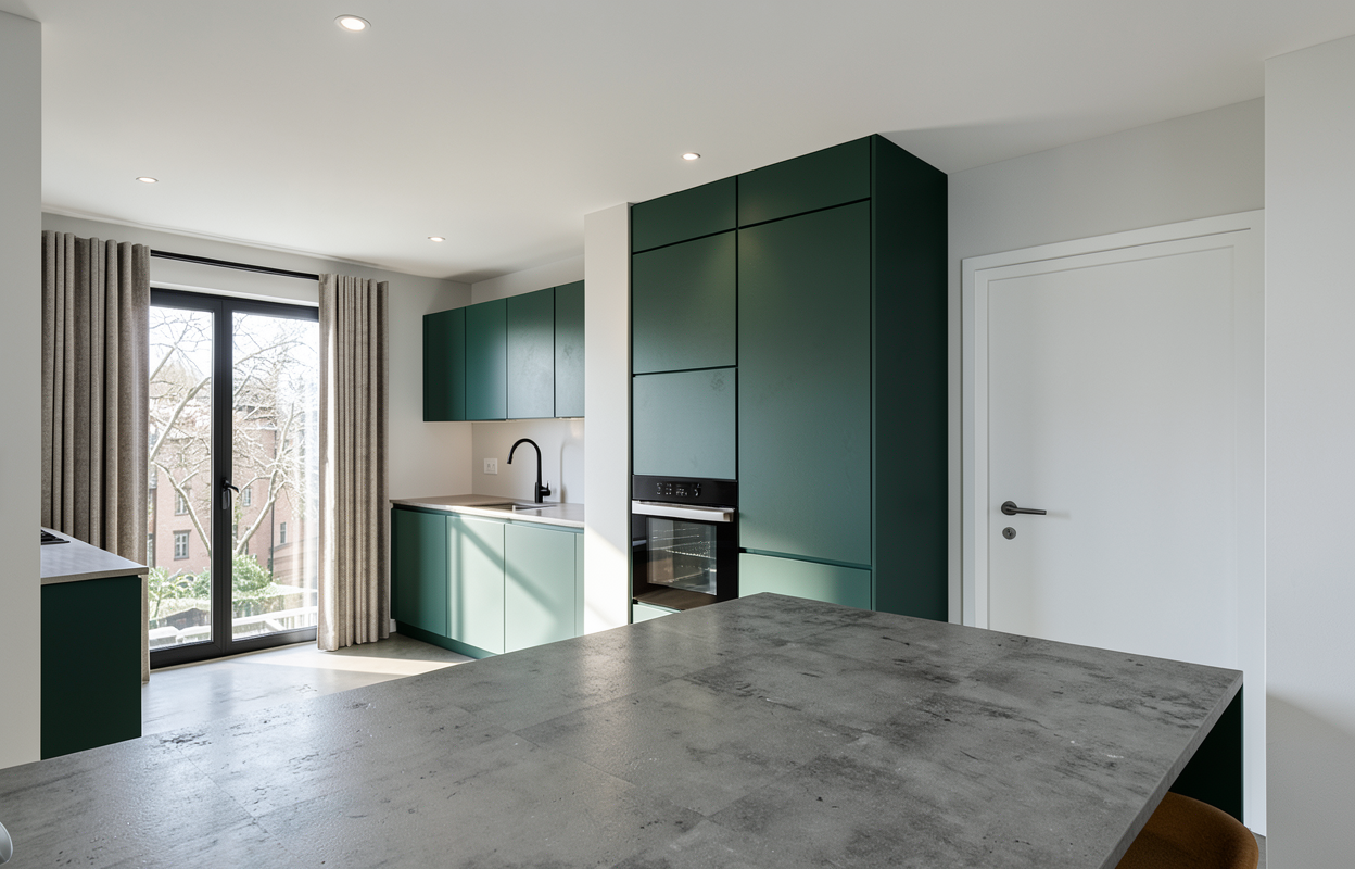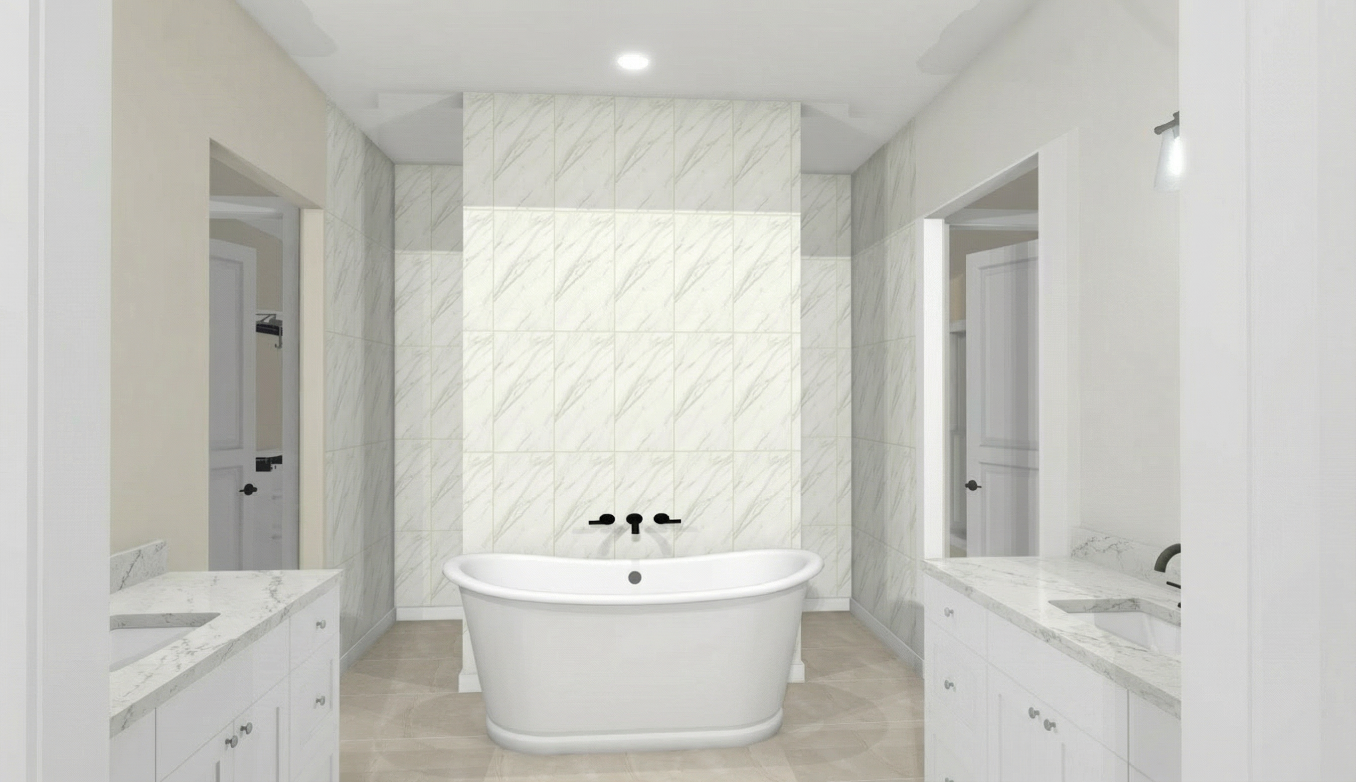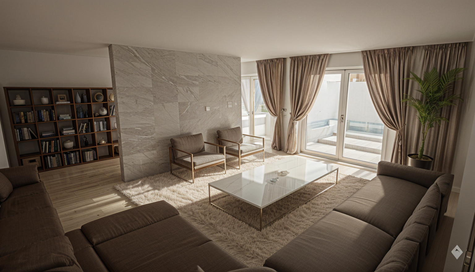 floor tile a light concrete look don t show any lighting handles are travertine stone please add a water front view with landscaping this project is 23a yellambie st yowie bay nsw this room is slightly elevated on the hill and there is a verandah that runs around the window with timber post and wire balustrade add a textured look wool rug under bed