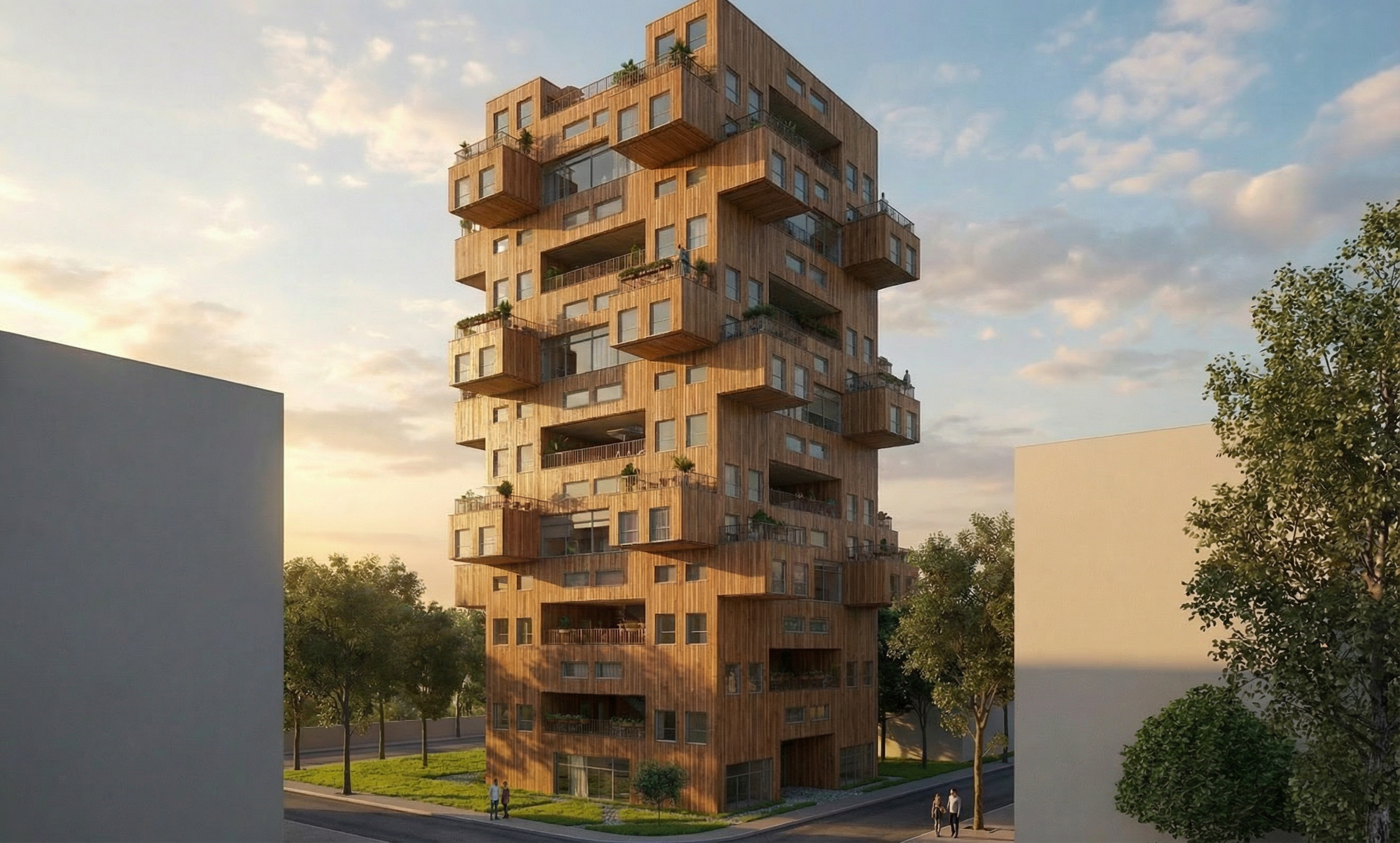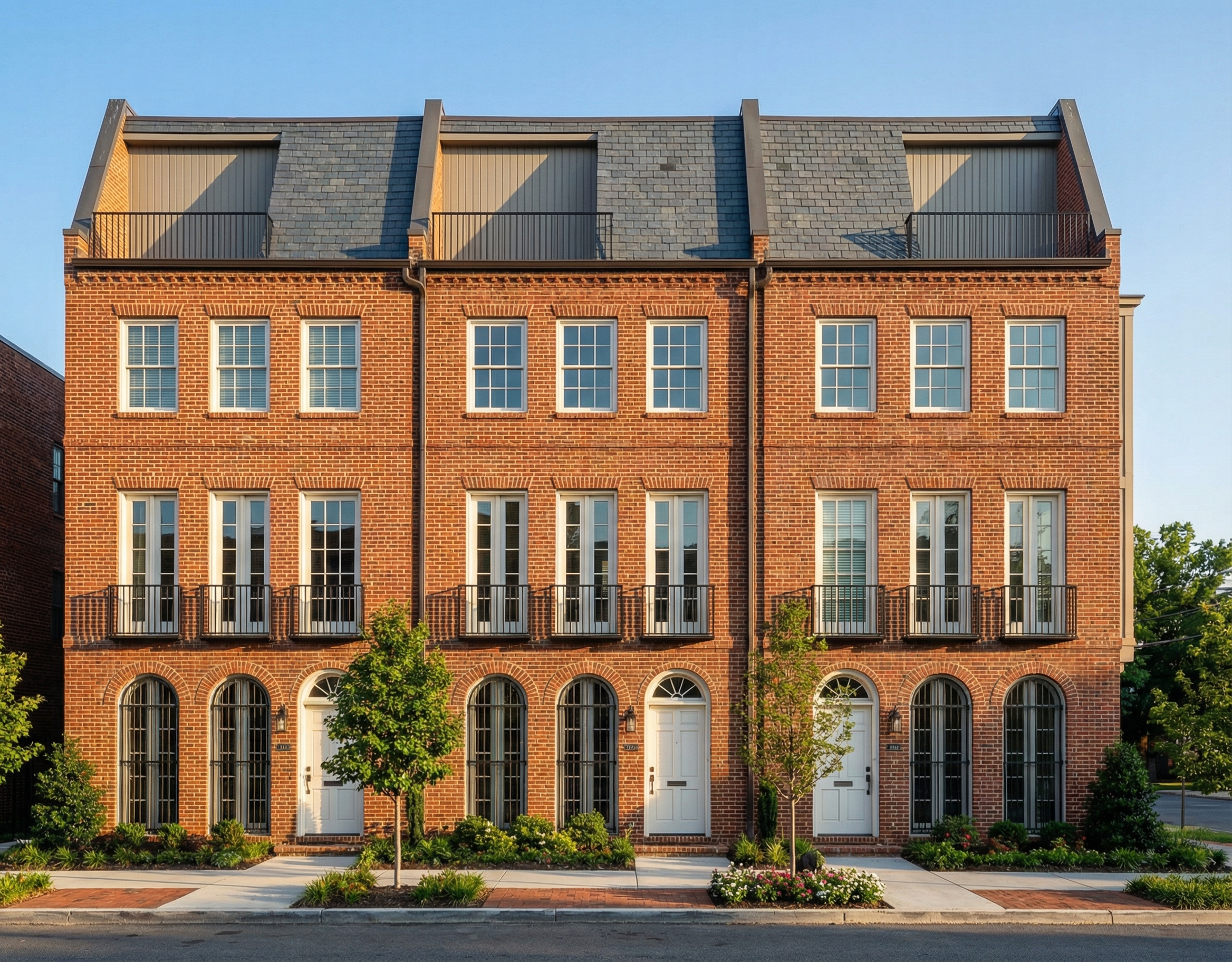 render in architectural watercolor style add people on sidewalk shown a different perspective view