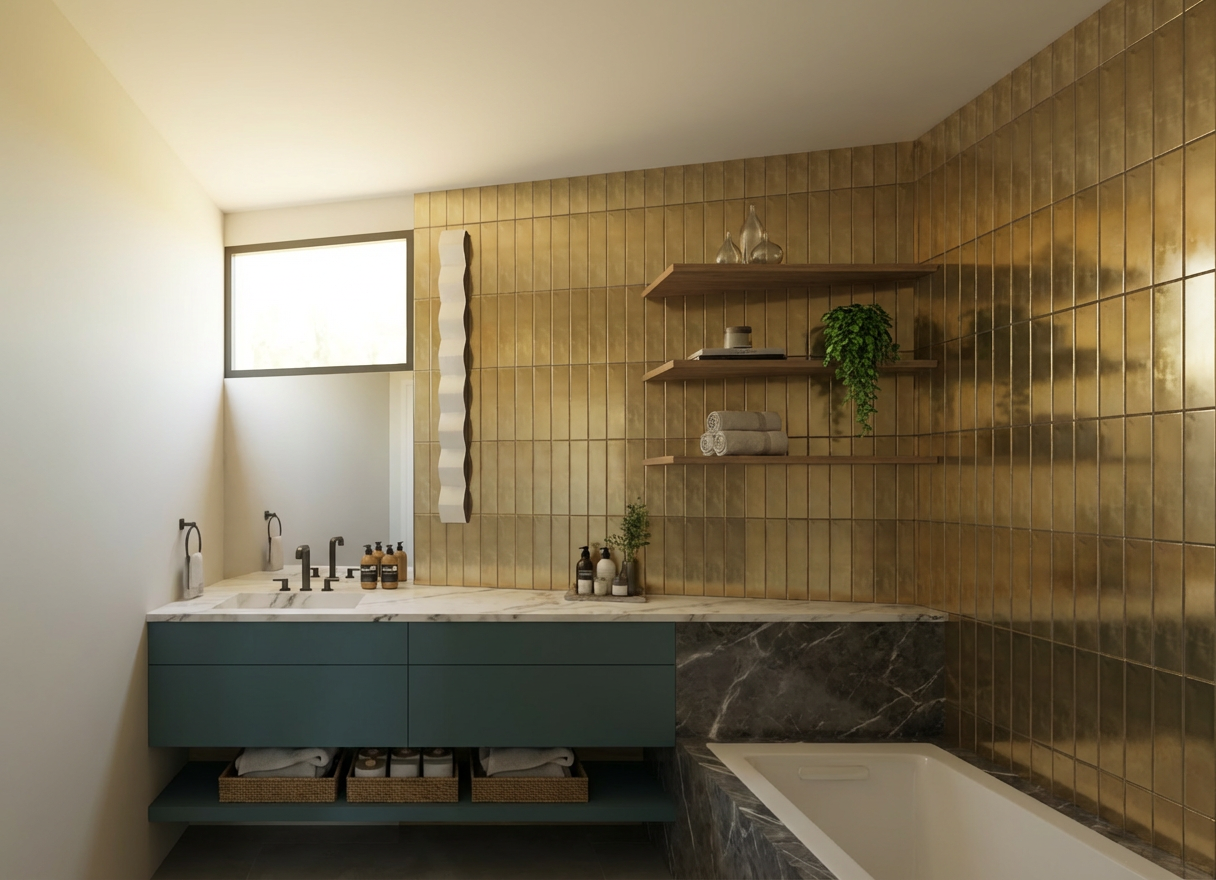 the yellow tile is metallic gold subway straight lay standing the material above sink is mirror the counter and bathtub granite are the same add a tree outside the cabinet is grey blue