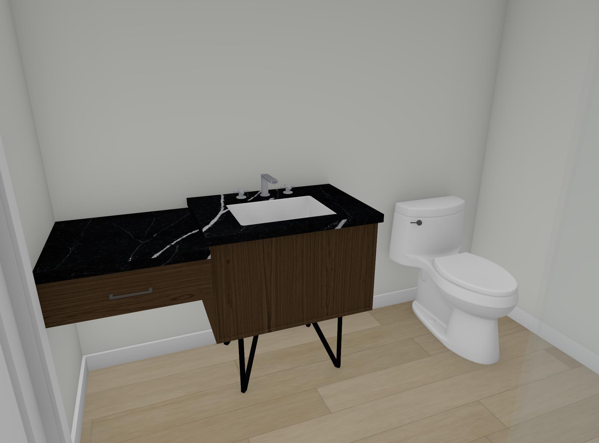 add a large rectangular mirror behind the vanity and the accessory drawer with led light on the perimeter add a toilet paper holder in polished chrome close to the toilet and a shelf above the toilet the only light is from spot lights above do not add a window