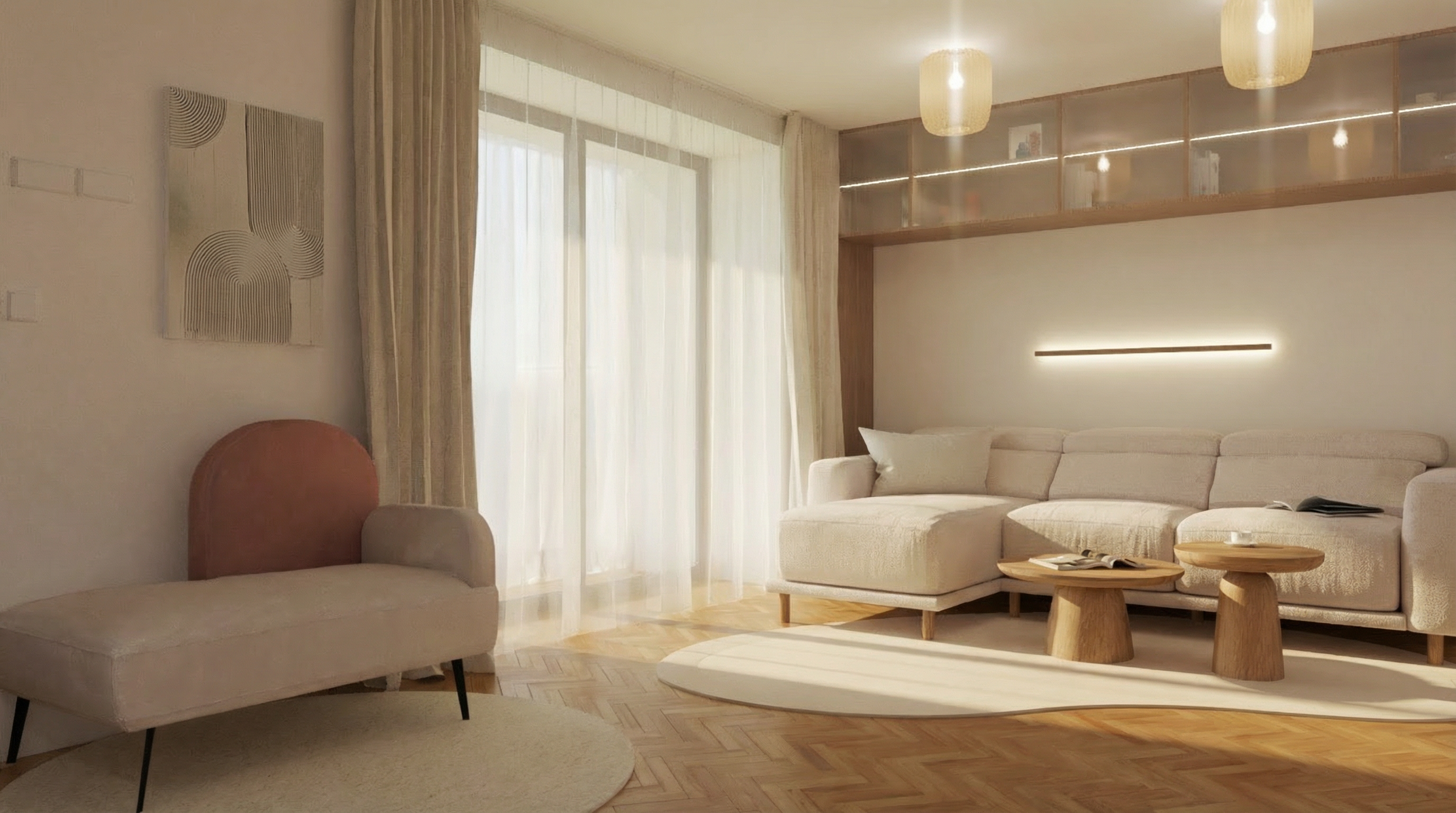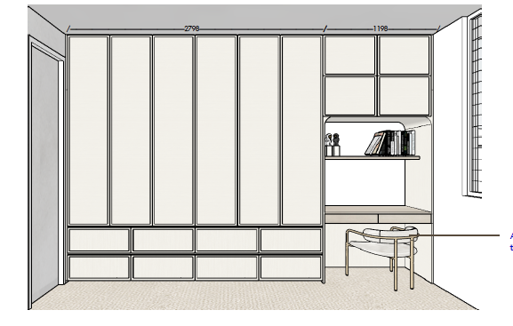 the cupboards should be wood veneer light colour boston oak plush carpet led strip under desk and shelves