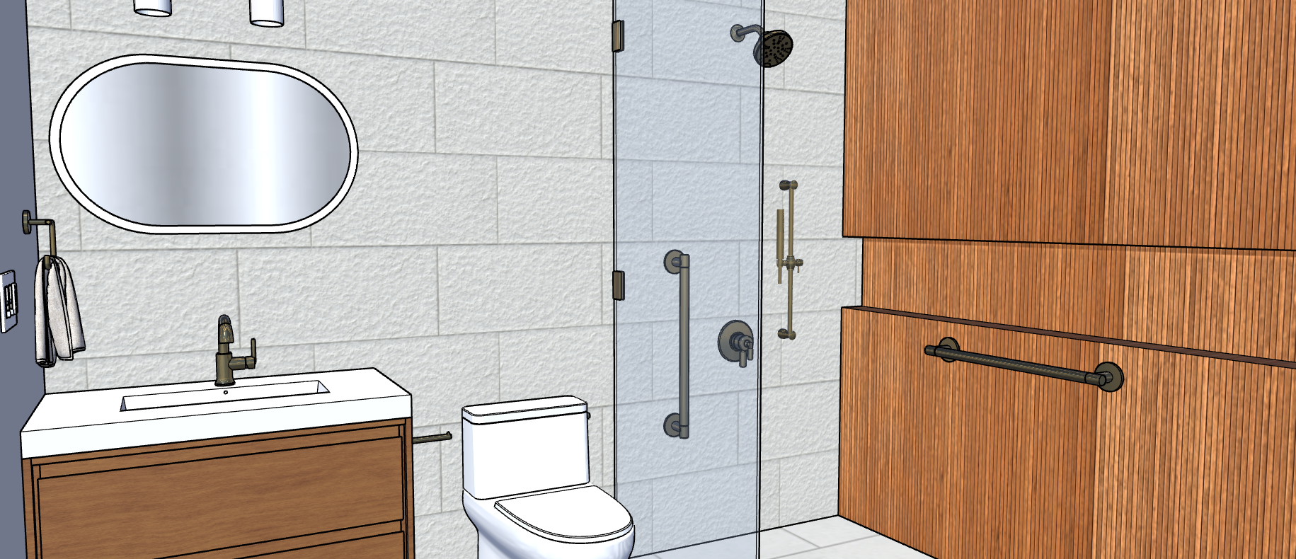preserve all existing textures geometry materials colors and proportions overall scene is evenly brightened using neutral warm lighting only do not add highlights glow reflections or new light sources lighting comes only from mirror with soft white semi transparent backlit halo warm evenly diffused there is no sunlight nor any light source other than the vanity light and backlit mirror the shower head and all shower fixtures are not light sources and emit no light all metal hardware and accessories are brushed brass the vanity wall has tiles that are unicolor with 3d raw chiseled texture with a color code rgb 234 228 218 walls with no tile on them are painted in a rgb 234 228 218 color the light switches are white