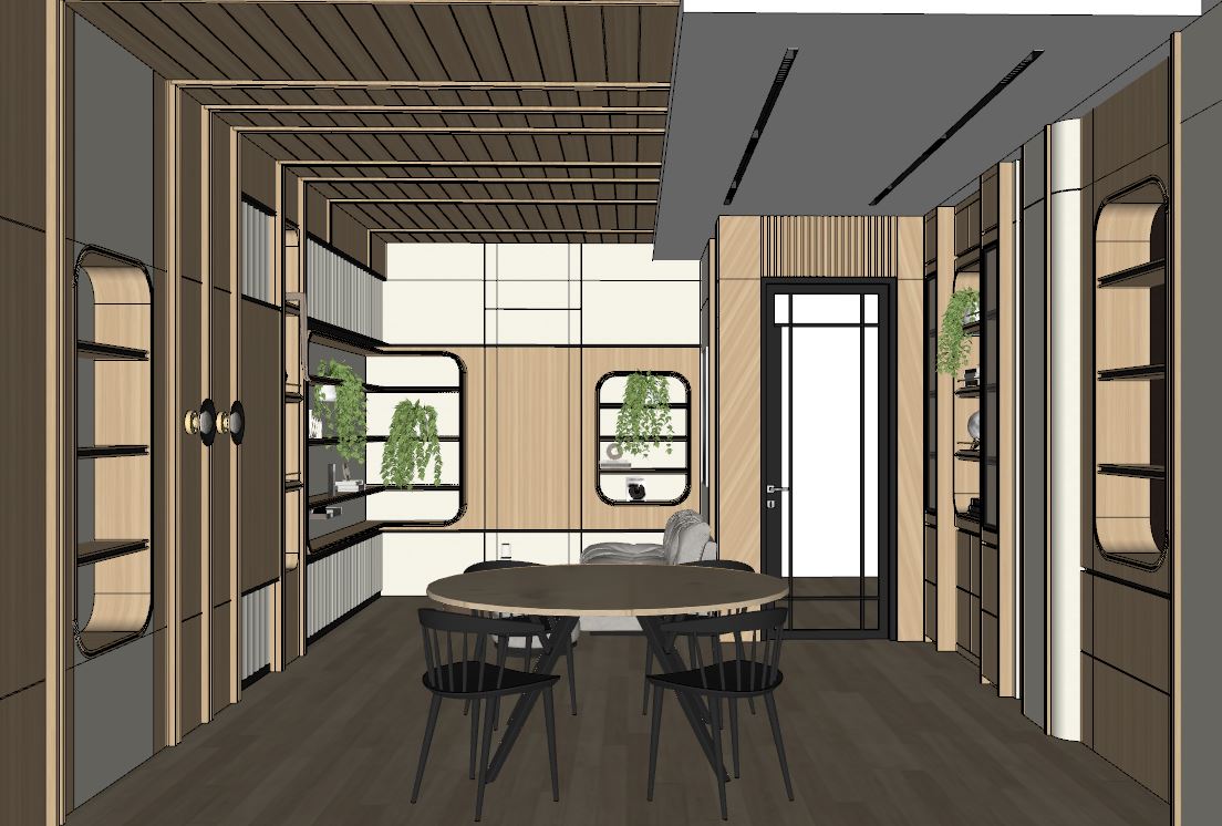 create an ultra realistic image without changing any of the structure shape design or materials dont resize the jpeg use soft light wood texture for the floor don t change the color material or shape add spotlights to the ceiling add indirect light to shelves and add some decorations and do not change the color of textures use light wood texture for ceiling please do not change the materials