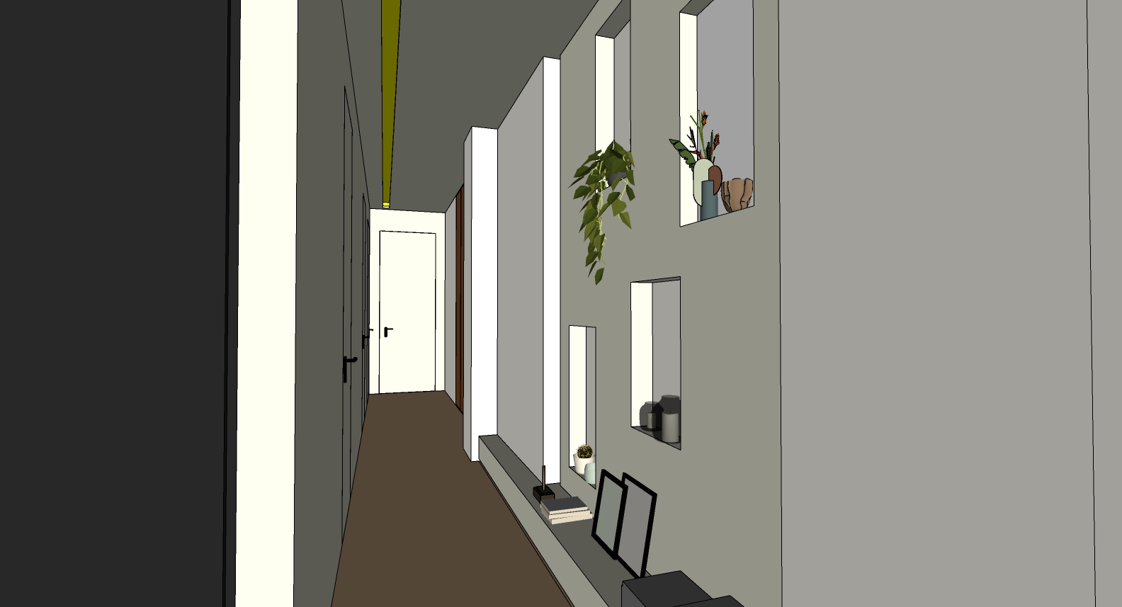 modern and minimalist hallway with elegant furnishings a flush fitting door white walls and a herringbone parquet floor a flat white false ceiling with spotlights and leds is complemented by ambient and soft artificial lighting that creates a relaxing atmosphere the shapes and materials remain the same