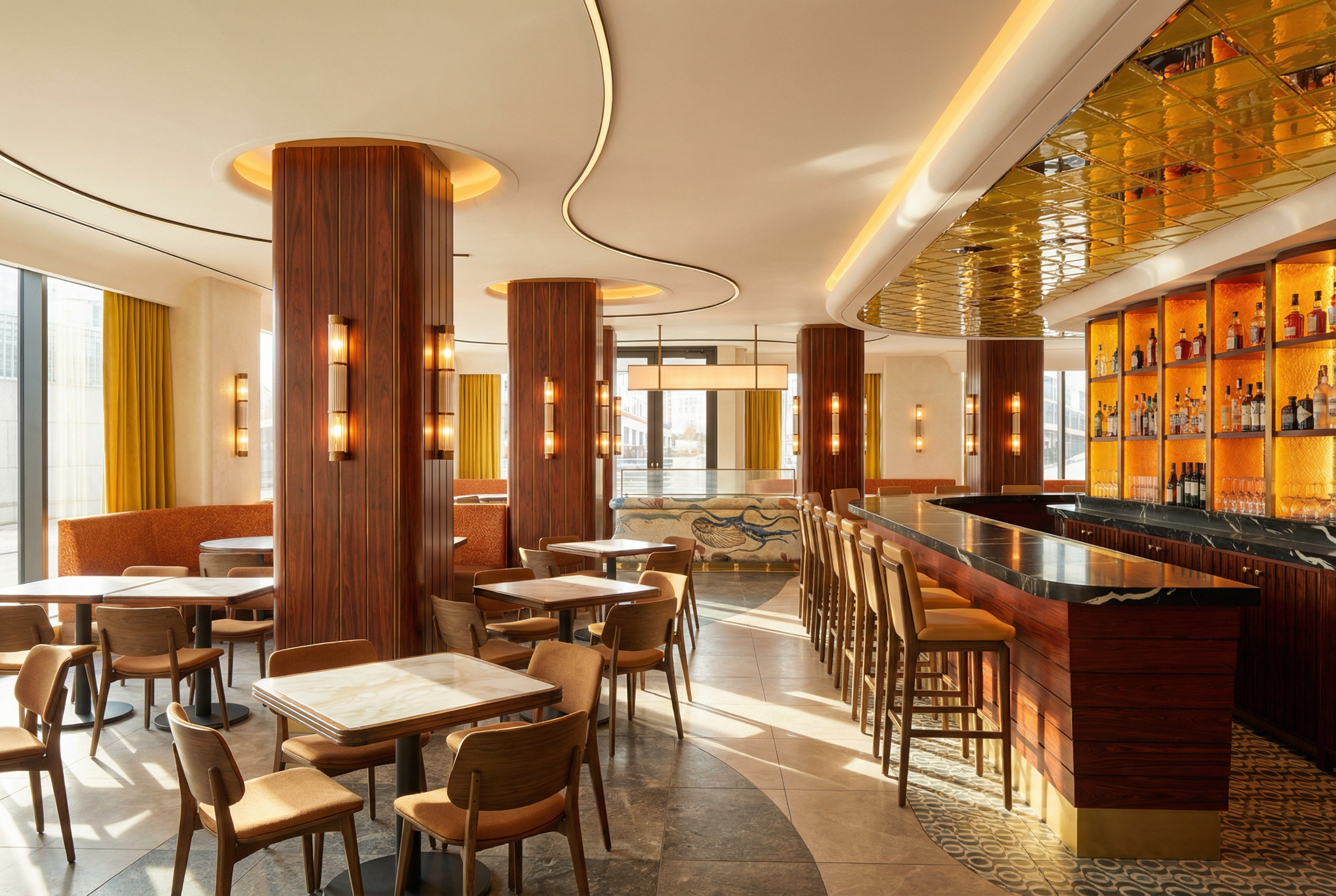 transform the provided restaurant interior image into a high end photorealistic render with warm golden hour atmosphere soft glowing highlights and relaxed upscale coastal energy while keeping everything exactly the same same proportions same bar shape same booth seating same ceiling curves same wall finishes same yellow curtains same materials and same spatial configuration do not move or alter any objects geometry textures colors or furniture positions the chairs throughout the restaurant must remain exactly in the same locations and proportions but their materials should read realistically the bar stools should appear upholstered in soft reddish brown leather with subtle natural sheen and cushioned tactile texture the dining chairs at the tables should appear in the same reddish brown tone but upholstered in soft velour with a matte plush surface and gentle directional nap while keeping their shapes frames and positions unchanged add premium table settings including wine glasses champagne flutes tropical style cocktails elegant plates cutlery cloth napkins and a seafood tasting arrangement with oysters while keeping all tables and chairs in their exact positions include modern young guests seated at the bar and at selected tables casually social correctly scaled tastefully integrated without crowding or obstructing architectural details add two bartenders behind the bar preparing drinks and interacting naturally while preserving the bar s structure and alignment the mosaic seafood display counter must clearly appear filled with ice fish lobsters shrimp and shellfish with cool reflections moisture and texture while keeping its exact position and shape unchanged on the bar shelves add wine bottles and premium alcohol bottles arranged tastefully and evenly while keeping the shelving structure unchanged the shelving should feature warm and bright accent lighting enhancing reflections and bottle silhouettes the wall behind the bar shelves must clearly appear as amber glass in a deeper richer golden amber tone with a ribbed textured surface and illuminated from behind with warm vivid backlighting while maintaining its exact geometry proportions framing and alignment lighting should emphasize golden hour warmth gentle reflections soft shadows enhanced color richness and luxurious catalog level realism improve depth and realism through wood grain richness marble shine brass highlights fabric texture and polished clarity while keeping the entire scene exactly as originally designed