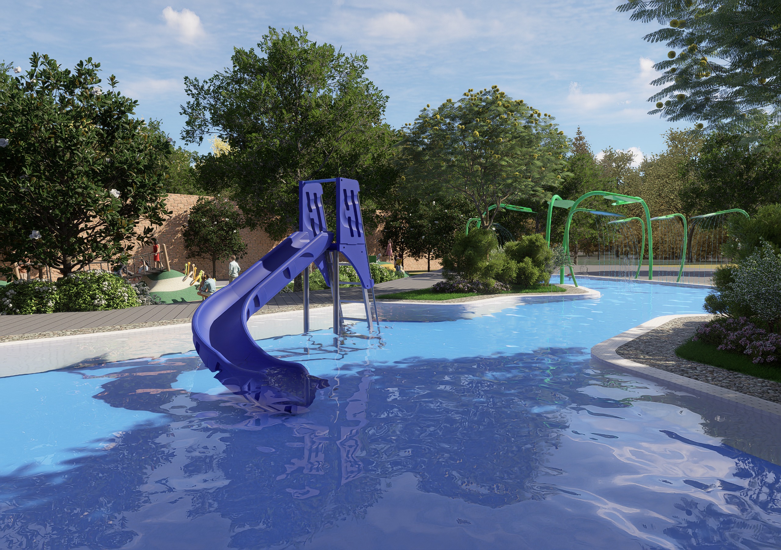 hyper realistic architectural render of a bustling outdoor children s pool area within a luxury private residential area suitable for a luxury magazine feature do not add any playground structure or playground flooring other than what is given visual foundation composition the overall scene composition camera angle and surrounding outdoor elements like implied landscaping are inspired by singapore park outdoor environment details the setting is clearly outdoors with lush well maintained landscaping surrounding the playground this includes tasteful trees and shrubbery that frame the scene without obstructing the playground the ground beneath and around the playground should be appropriate for an outdoor play area e g safety surfacing grass do not change the colors and design present in the given play area flooring vibe lighting liveliness the lighting replicates a vibrant high day time with directional light primarily from the top left creating rich highlights only making soft shadows no harsh shadows accepted the scene is exceptionally lively and bustling populated with a greater number of diverse children actively and dynamically playing on and around this specific playground model climbing sliding interacting adults are also present supervising or engaging in relaxed interaction within the well landscaped area the atmosphere is highly energetic happening and refined all materials and textures wood metal safety surfacing foliage building facades are rendered with a 4k uhd level of hyper realism and tactile quality matching the previous luxurious aesthetic output quality the final image should be clean free of watermarks and convey a premium aspirational quality