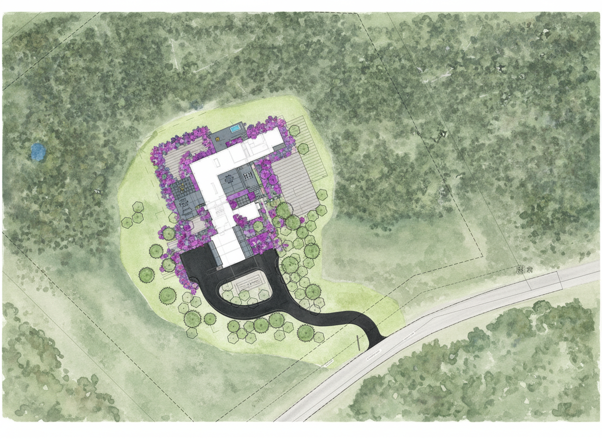 turn my landscape site plan into a water color render keep the aerial background unchanged green rectangles indicate grass purple indicates planting beds