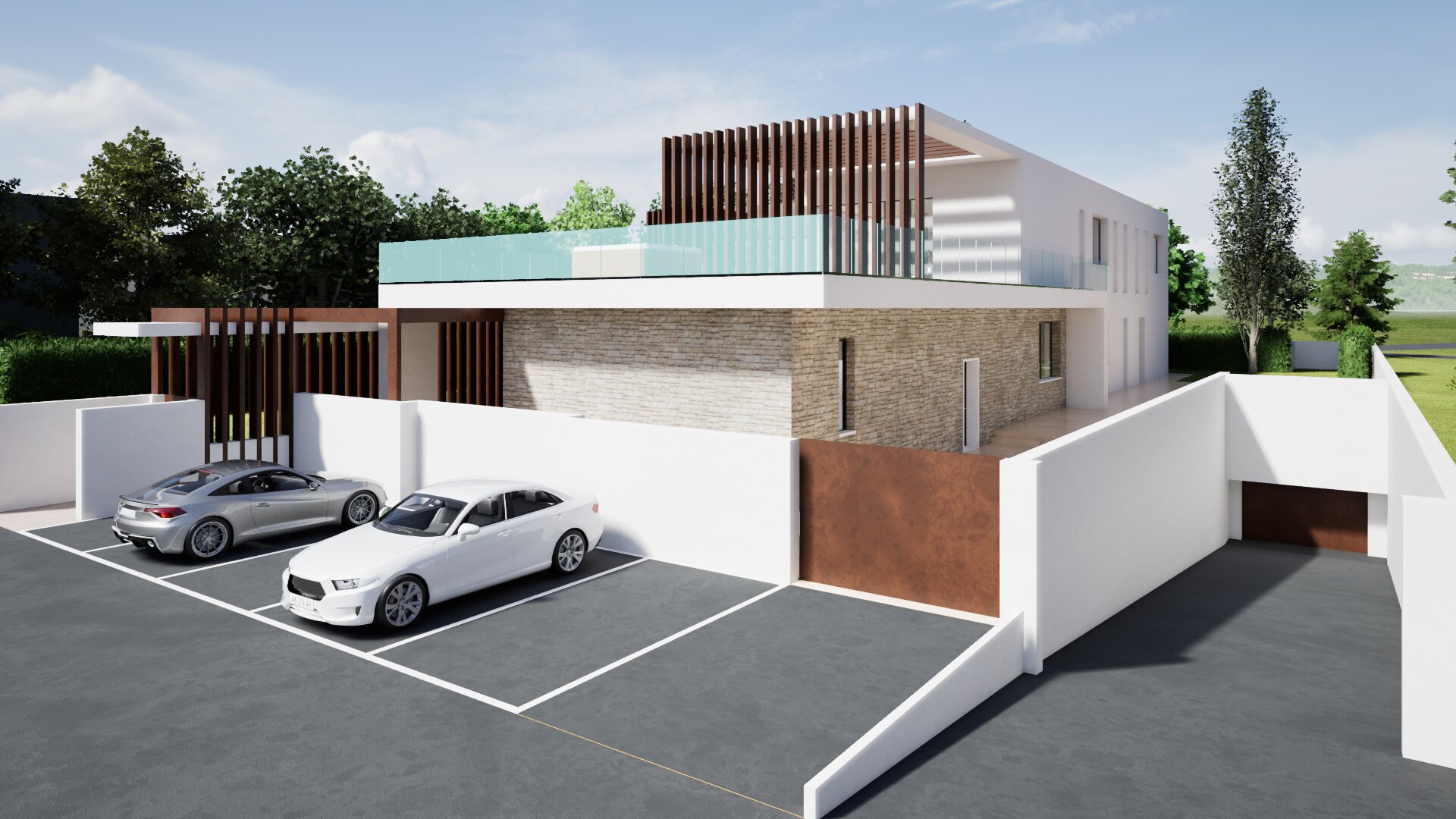 photo of a modern residential villa with sleek lines and contemporary features showcasing a blend of glass stone and steel corten elements
