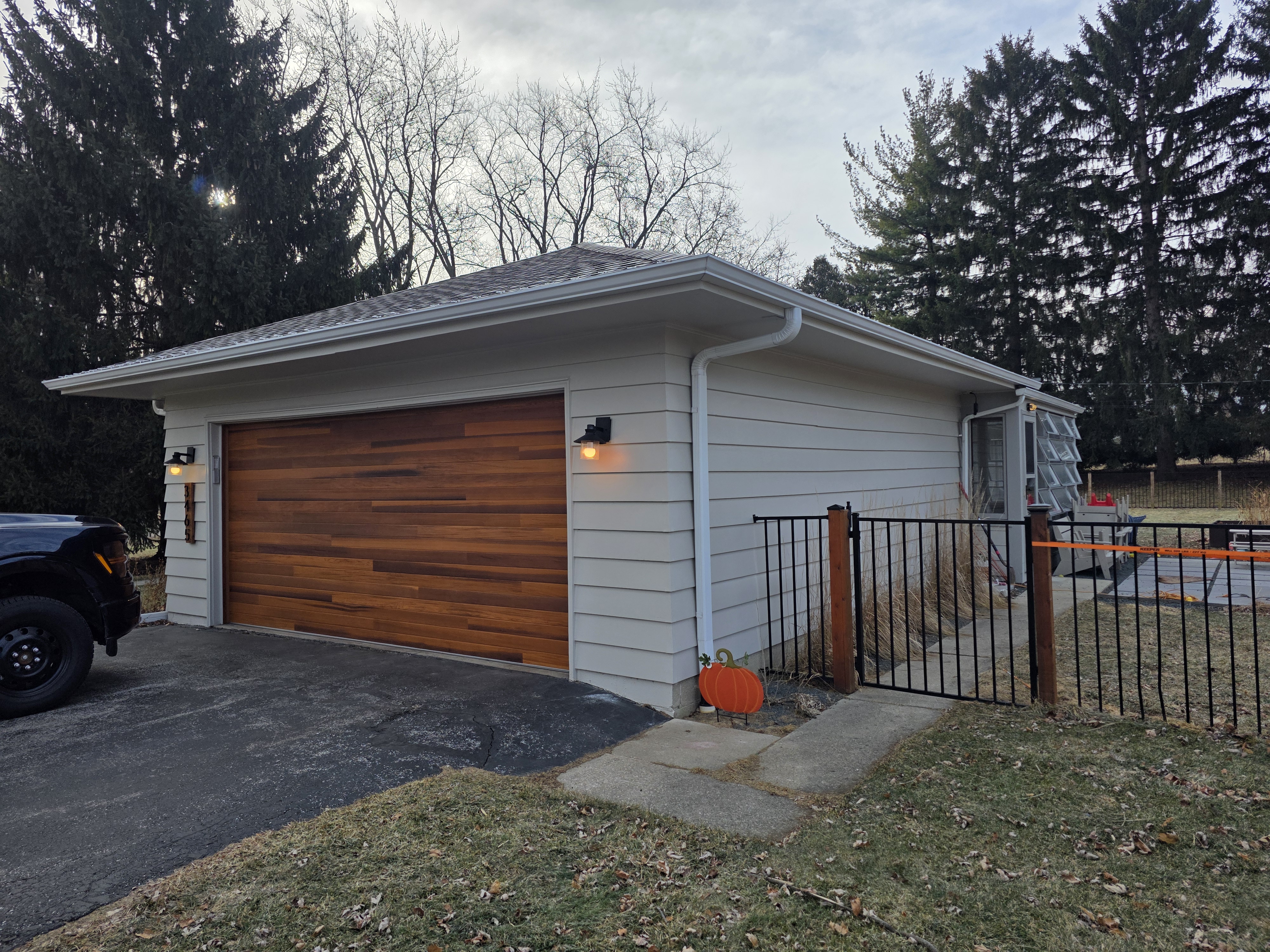 add wood plank soffits that match the garage door also re color the gutters and fascia of this house to dark bronze