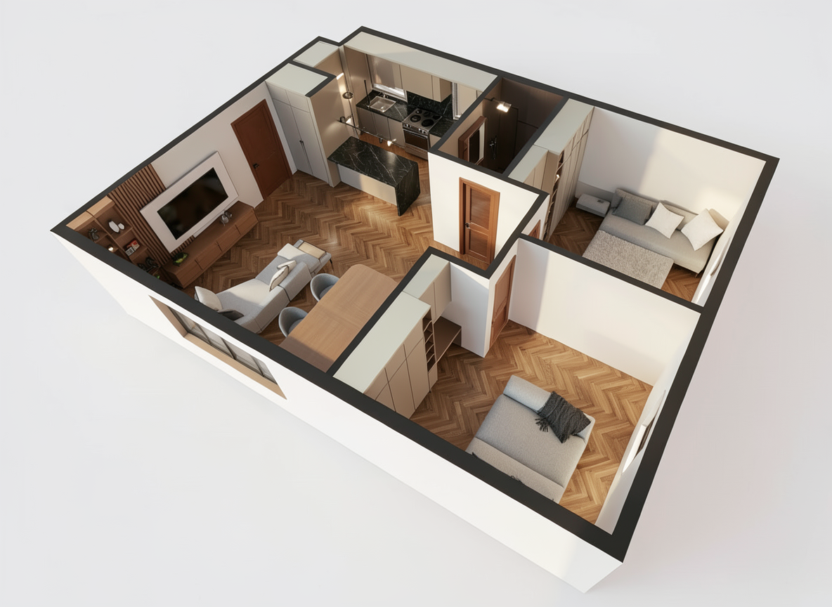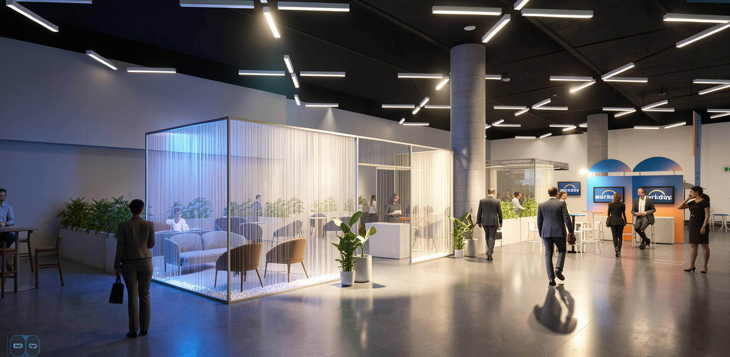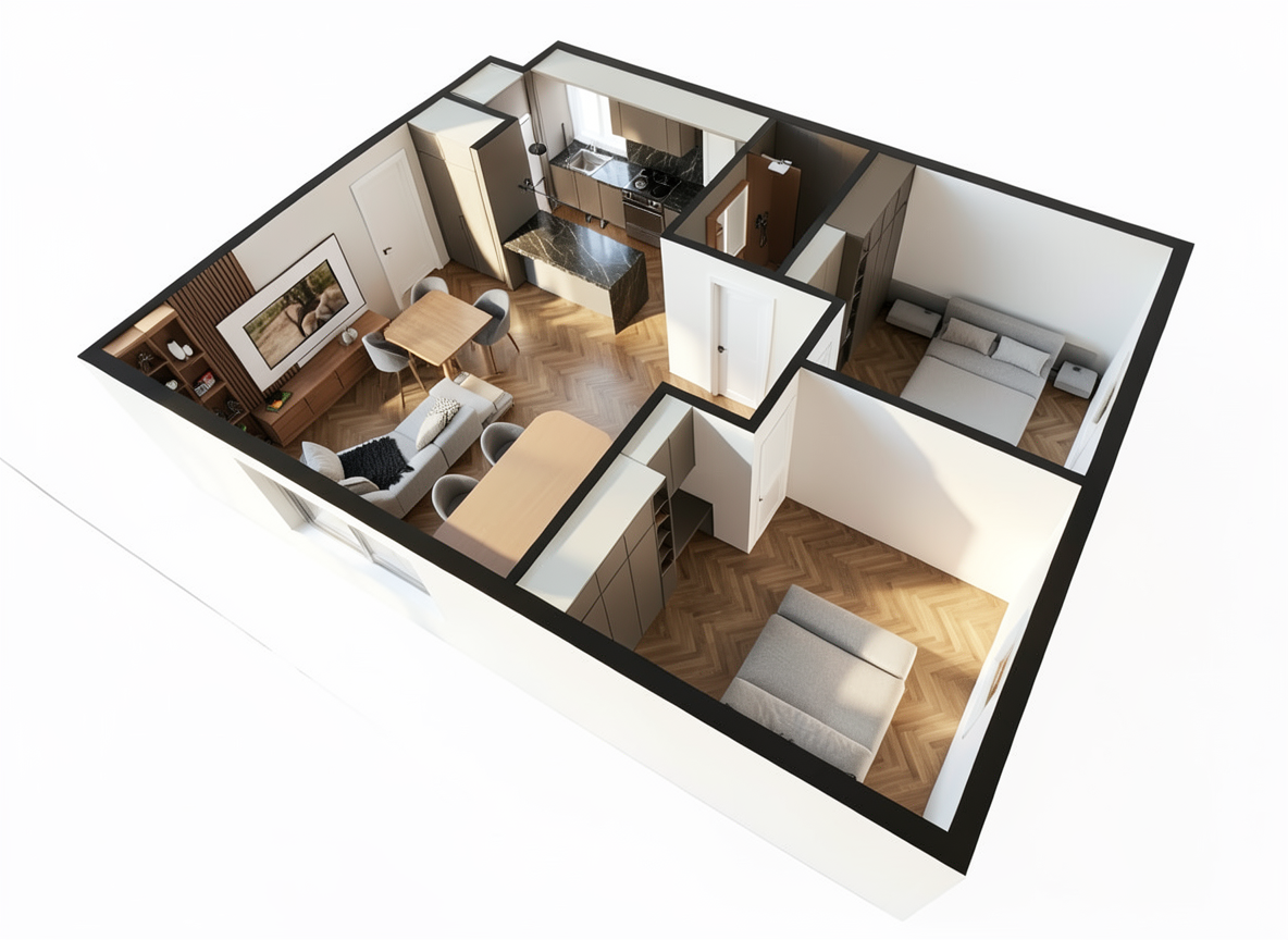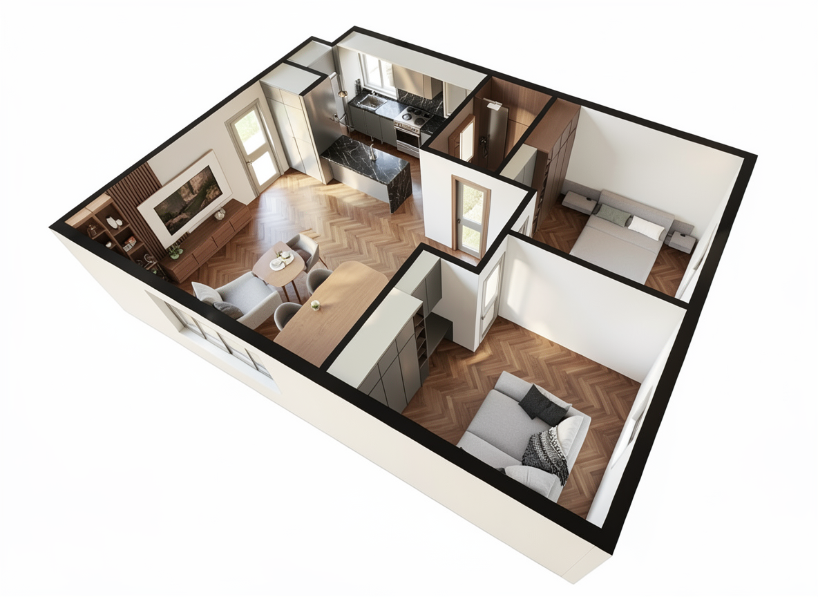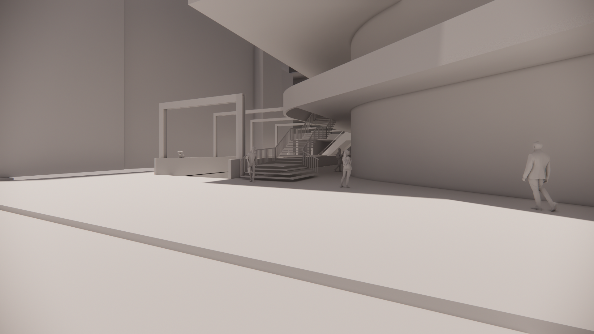 photorealistic architectural rendering of a contemporary public plaza the building frontage opens to a street edge with a realistic kerb and asphalt road in the foreground full height shopfront glazing to both ground floor and level 1 transparent glass with reflections and interior depth to the building on the right hammered slate paving at the pedestrian zone with rough uneven texture and natural tonal variation warm timber soffit lining above with linear grain and subtle variation between boards strong overhead sunlight entering the space casting crisp shadows from the building onto the pavement and road high contrast lighting with realistic global illumination and bounce light sunlight highlights the texture of the slate paving and creates grazing light across the curved concrete wall timber soffit shows natural grain and tonal shifts buildings on the left side of the scene are existing structures to be retained shown in exposed brick with realistic texture varied brick tones visible mortar joints and subtle weathering the sloped element on the left is clearly represented as an accessible ramp with a continuous smooth gradient highly realistic pbr materials accurate roughness and reflectivity glass shows reflections of the street and sky slight interior visibility asphalt slightly rough and matte slate paving detailed and tactile include realistic pedestrians near the entrance and along the street edge casually dressed natural poses