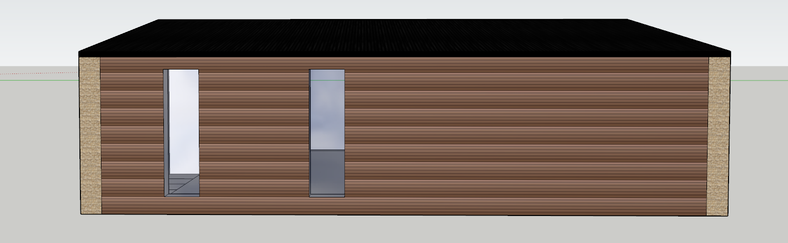 brown pvc wood effect cladding with stone pillers on corners and middel black roof and fessia clear glass to window to be a brown frame change scenery to a garden