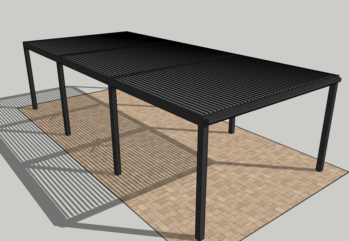 make this into a nice aluminum louver roof with a darker gray color frame add a nice nature background with some tall pine trees