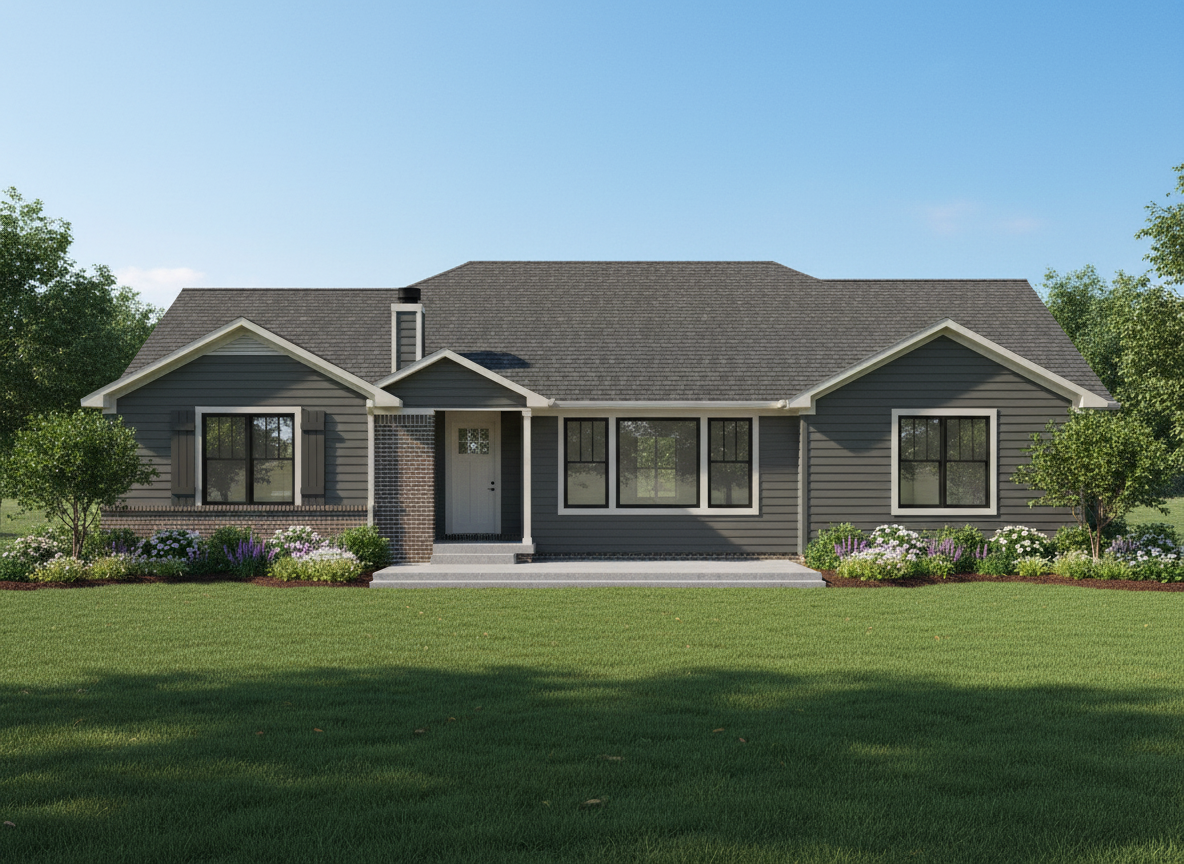 do a rear 3d rendering of this home on a sunny day with landscaping brick is country road color from the reference windows are black from the reference shingles are charcoal from the reference gutters are black from the reference siding is iron ore from the reference trim is morris grey from the reference