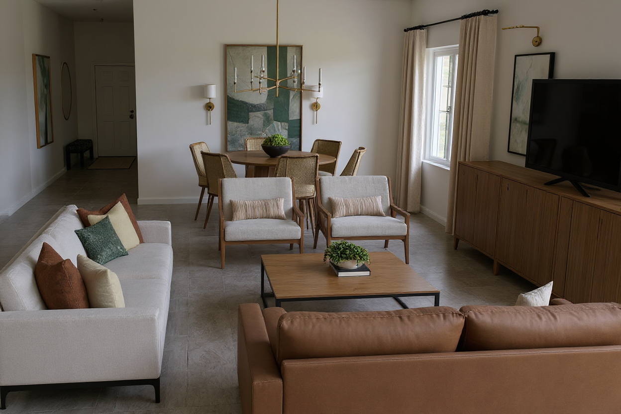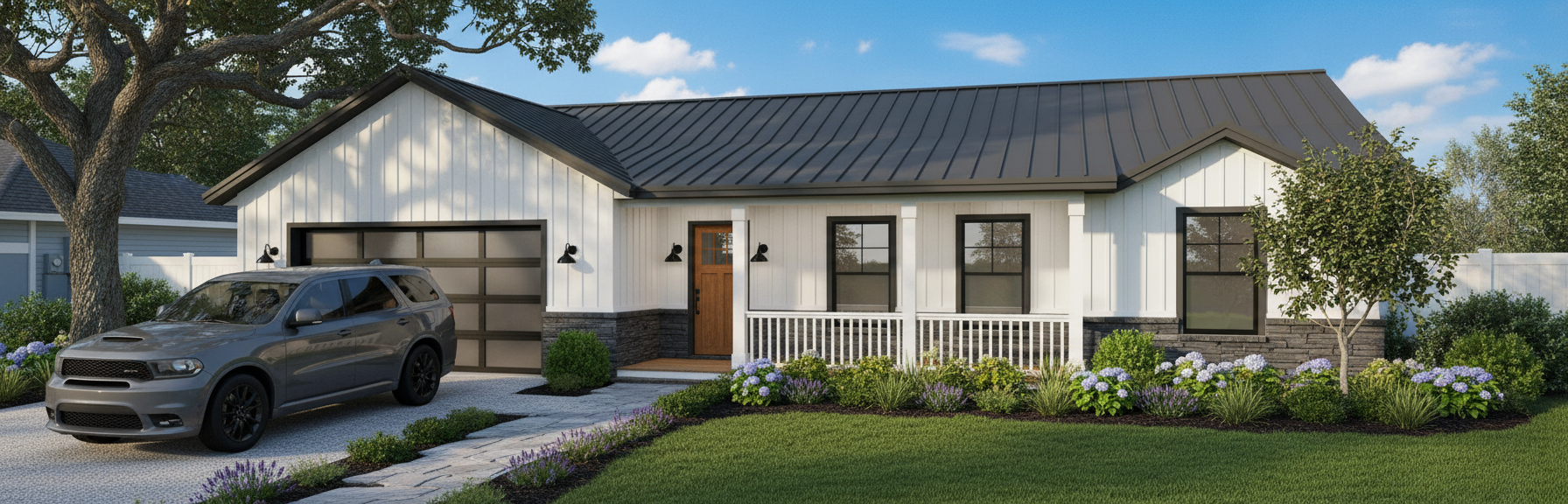 show house in a rustic style remove trees in front of the house and add new landscaping