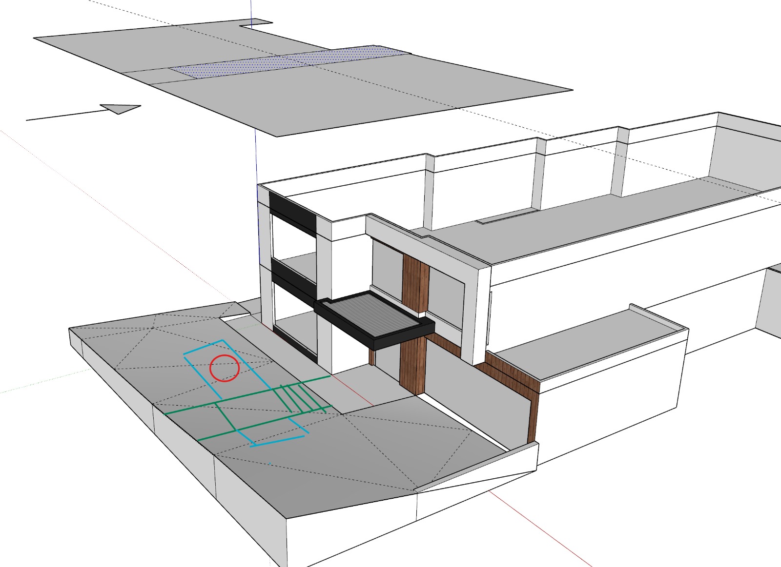 a modern residential property with a driveway to the right hand side floating concrete steps through the centre to the front house entry and a tiered modern water feature with a walk over bridge incorporated in the path