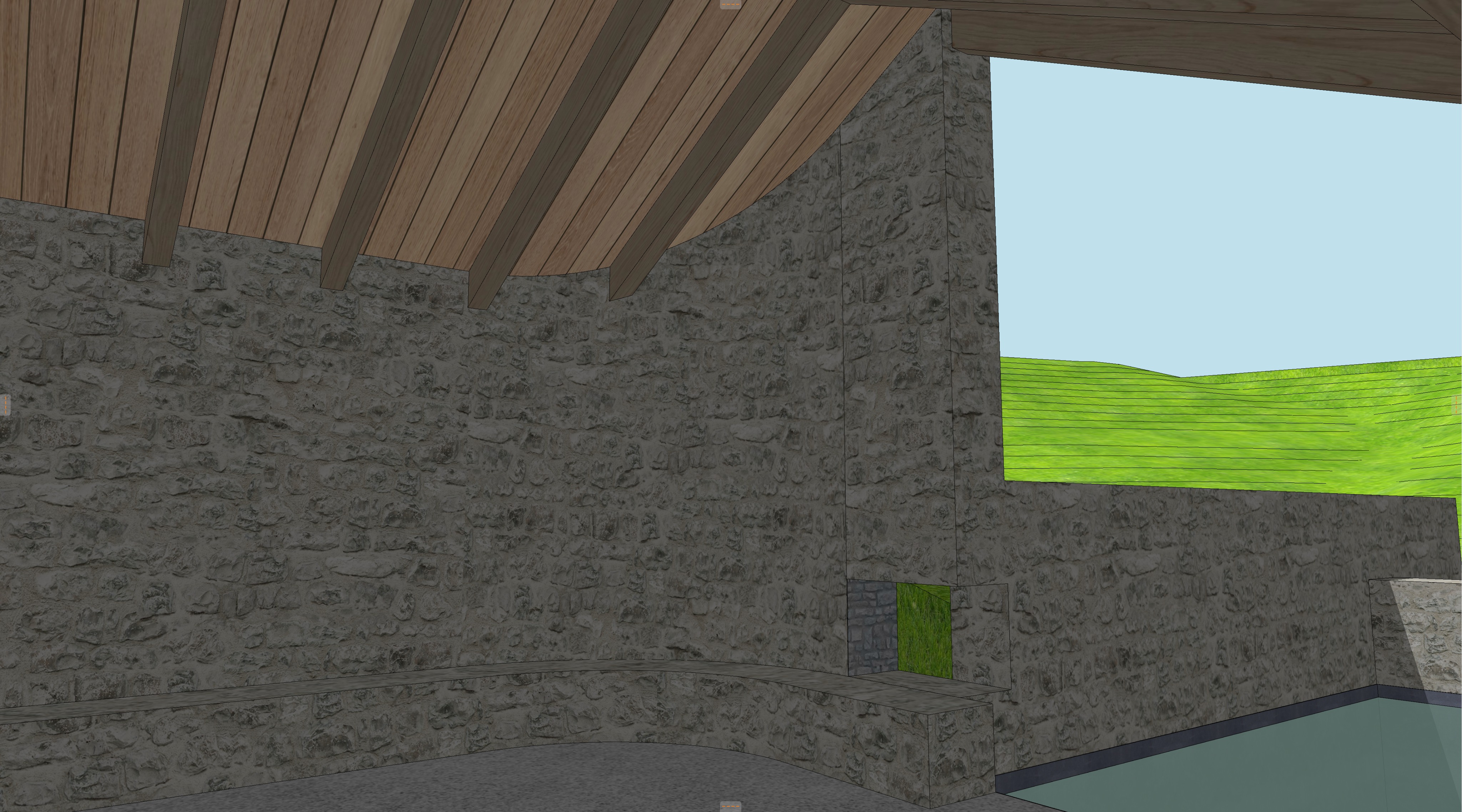 landscape hillside with sagebrush and tall wild grasses brown drystack stone walls corten standing seam metal roof clouds in the sky add fire to fireplace in curved wall soffit to be reclaimed douglas fir wood