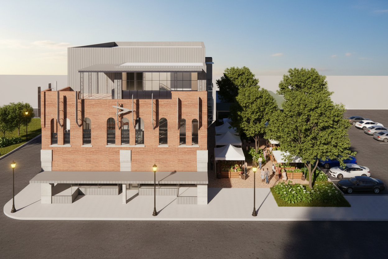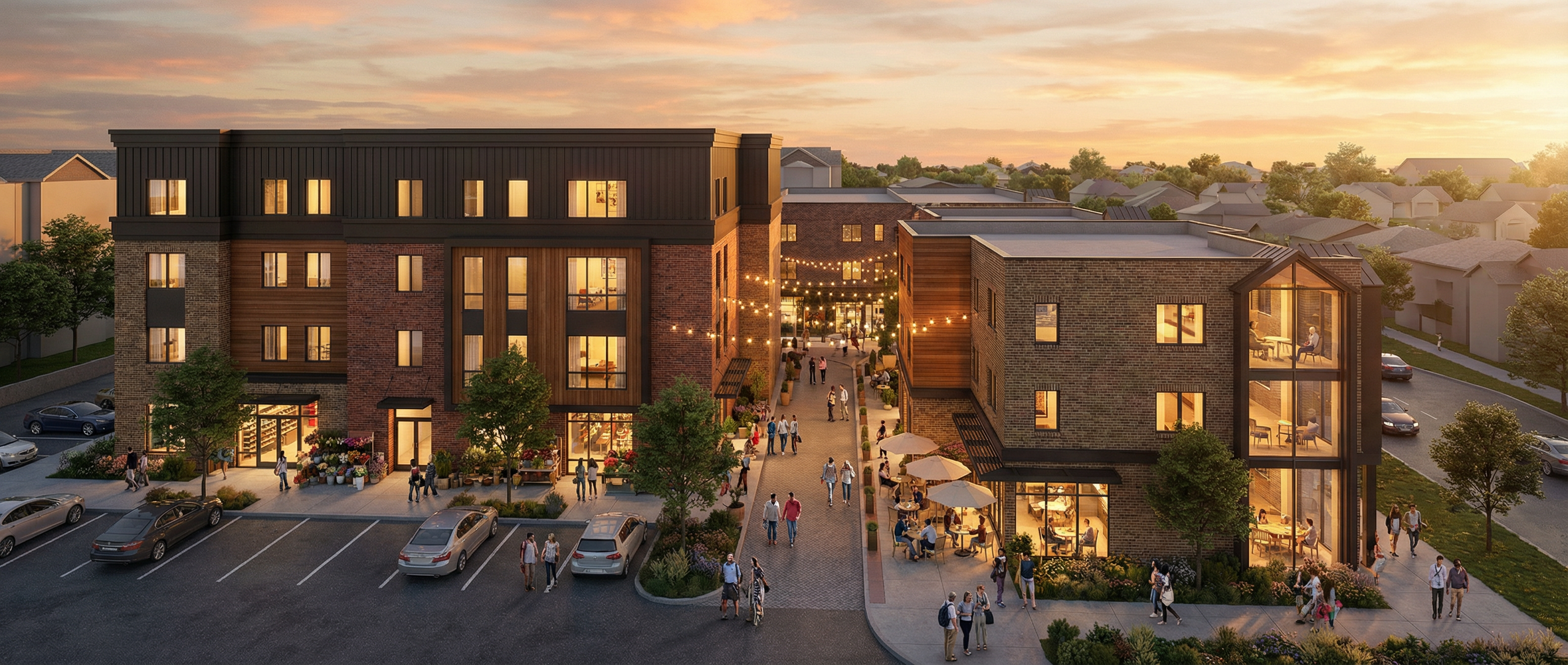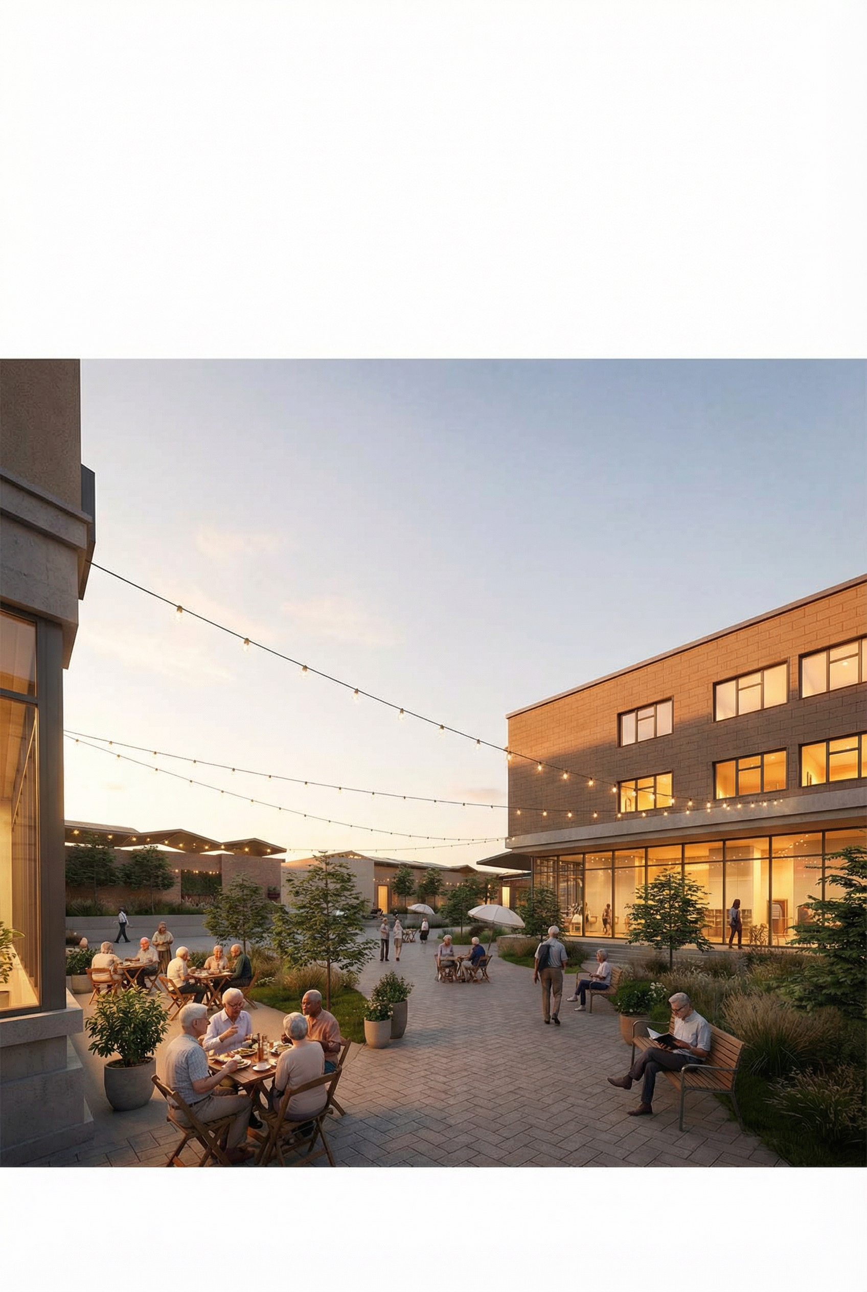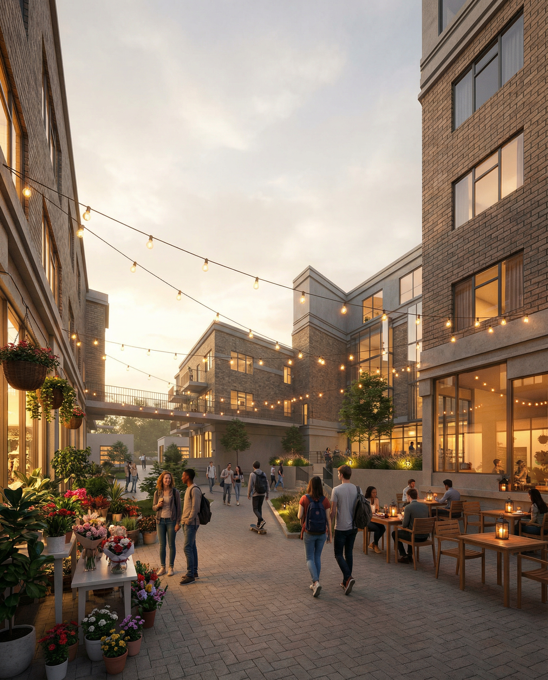 use the exact building geometry from the reference image do not change or reinterpret any architecture preserve all massing window layouts materials setbacks adu structures alley dimensions and proportions exactly as shown only enhance lighting people environment and context render a cinematic golden hour hero shot from this elevated angle overlooking the alley spine maintain the exact design of the east building student housing adus senior building walkway bridge and the entire alley sequence context requirements baltimore morgan state surround the site with baltimore style rowhomes narrow brick 2 3 story stoops tight spacing include glimpses of morgan state university campus architecture in the medium long background modern academic buildings msu colors campus green flags or banners subtle but recognizable maintain an urban baltimore neighborhood feel sidewalks tree pits light poles crosswalks slightly imperfect paving city textures but keep it clean and safe activation atmosphere sunset golden hour with long shadows string lights running down the alley guiding the eye toward the retail spine lots of students seniors families and community members walking talking sitting carrying bags grabbing food outdoor caf seating a small flower stand micro retail people on laptops soft landscaping planters umbrellas warm interior window glow lively intergenerational energy this is the main spine of the project important do not change the architecture do not alter the fa ade materials do not add new massing or remove any buildings if unsure about a detail preserve it exactly instead of guessing
