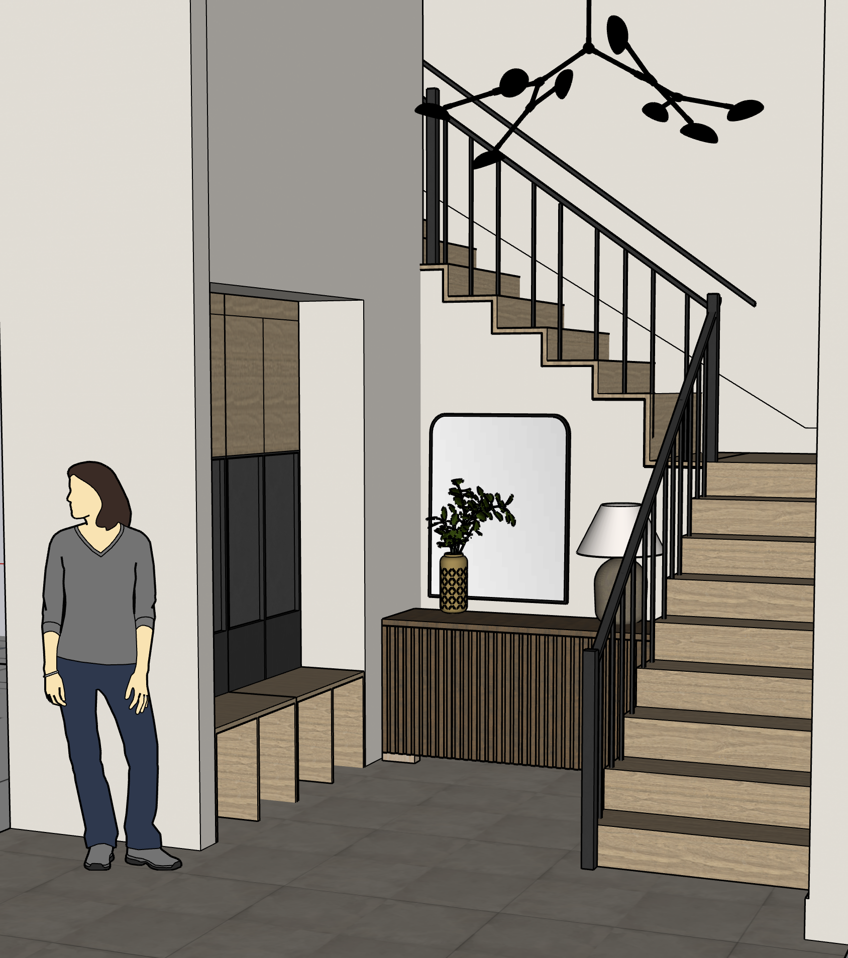 render photo realistic dont change anything can you add a carpet runner on the stairs mountain plaid blues but light gray lines render with the lights on remove the carpet on the actual first floor only on the stairs keep the lockers exatly how i have it dont change that