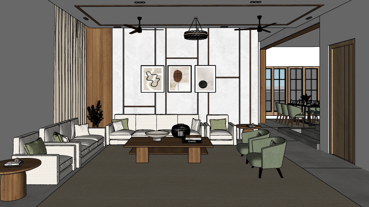 create a realistic render of a contemporary living space designed in wabi sabi style maintain the existing color palette from the reference image soft beige tones warm wood textures muted greens and subtle whites incorporate soft ambient lighting to evoke calmness and natural warmth add ceiling lights that blend seamlessly with the design providing a balanced diffused glow without overpowering the natural textures highlight the tactile finishes of the walls wooden panels and fabric upholstery emphasize simplicity organic balance and the beauty of imperfection with a serene minimal and lived in feel