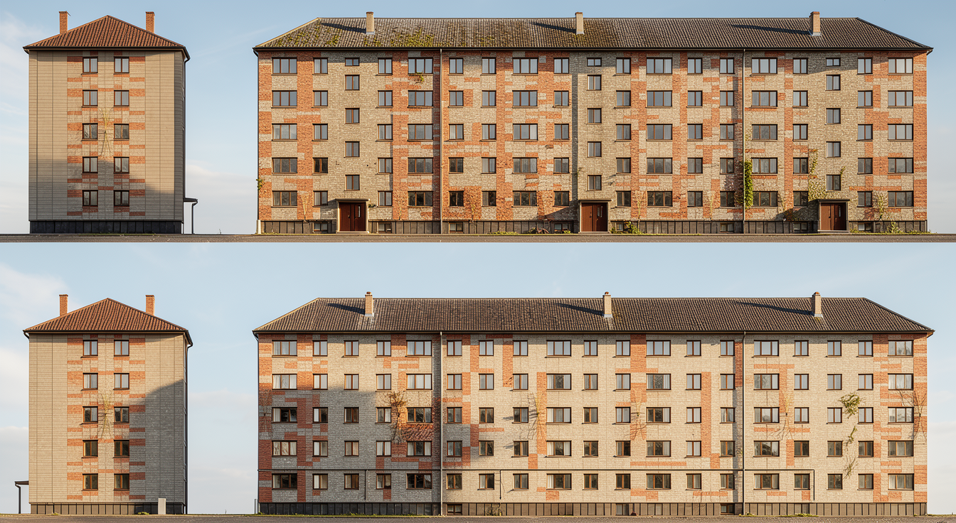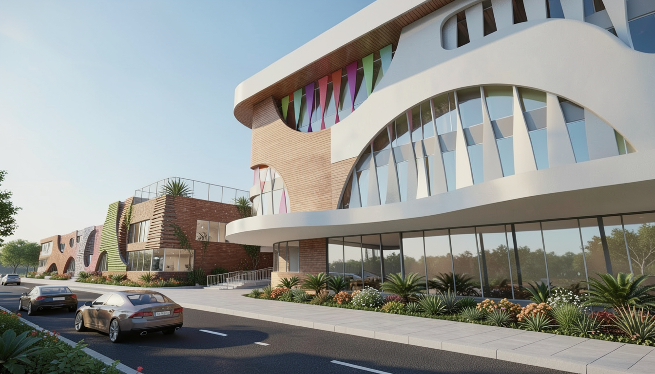 keep the cars and glass walls and the entire shape of the picture make the twisted facade more colorful add other materials on other parts keep the interiors empty add landscaping and pavement on the ground floor add road where the cars are