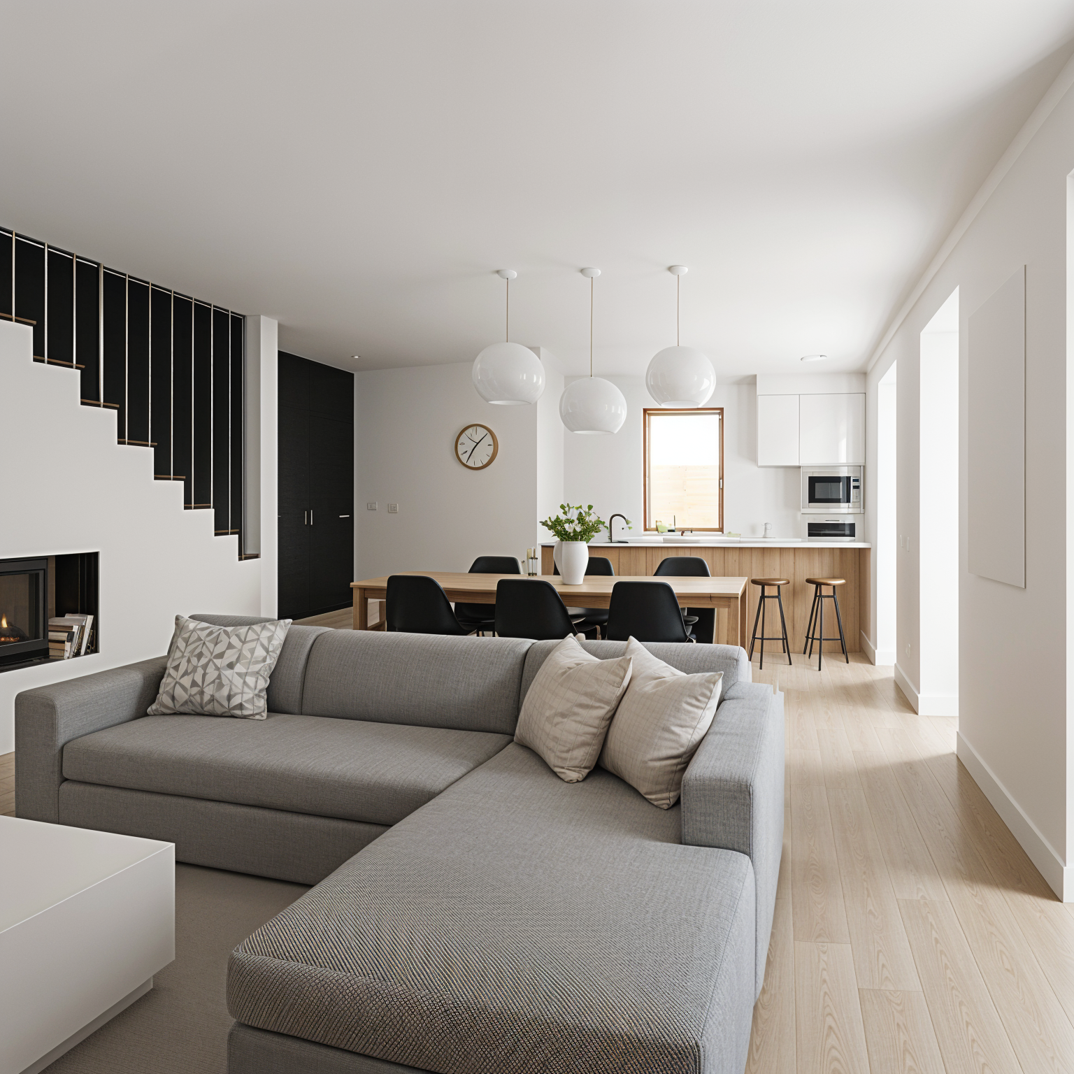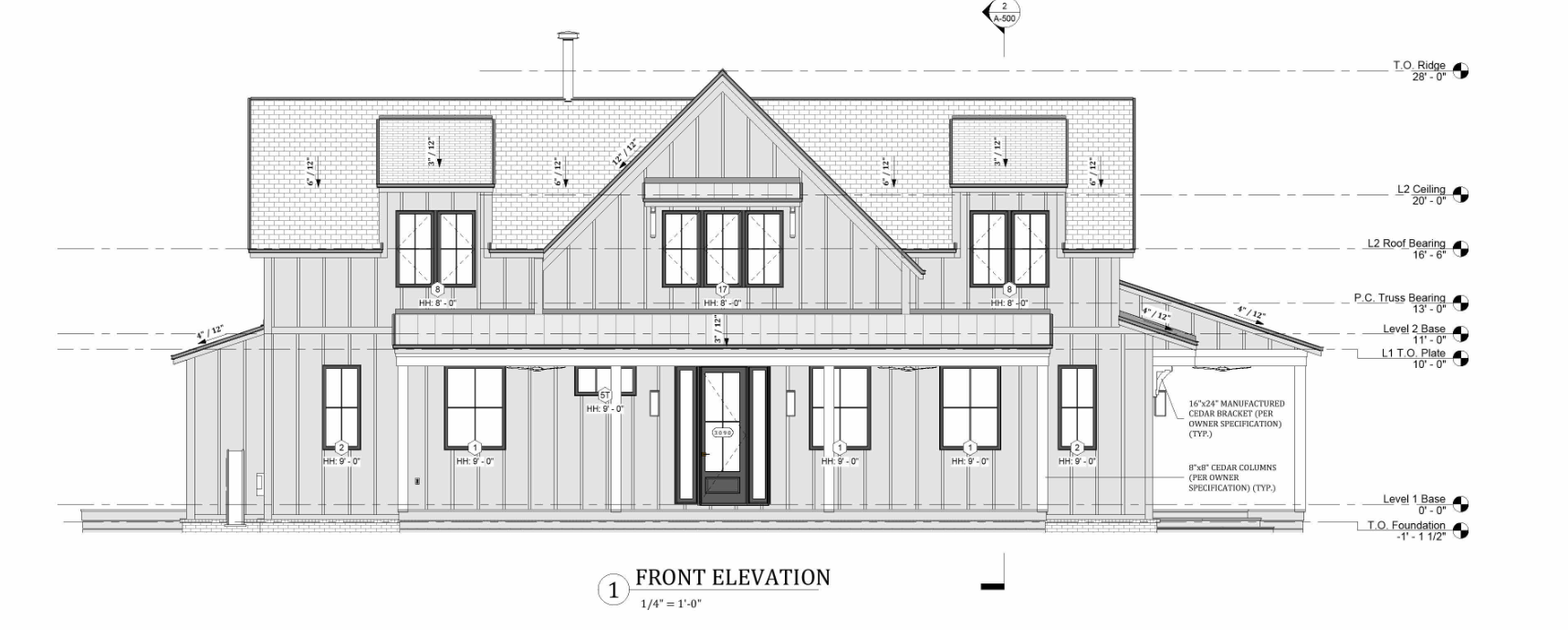 modernist exterior shot this is a front elevation of a custom home render with grey standing seam roof for the lower porch roof and a black shingle on the upper roof sections black window trim cream board and batten stained timber framed front porch and side porch framing the yard should include natural modern landscaping architecture