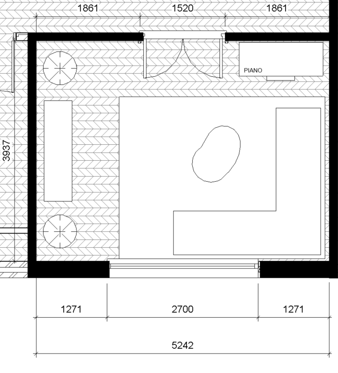 convert this floor plan into a architectural isometric 3d view of a living room show the space from an elevated angle with furniture walls and details visible timber entertainment unit black piano timber coffee table beige white fabric sofa two plants either side green pot use the same furniture as shows on the plan do not change the orientation of the floorplan
