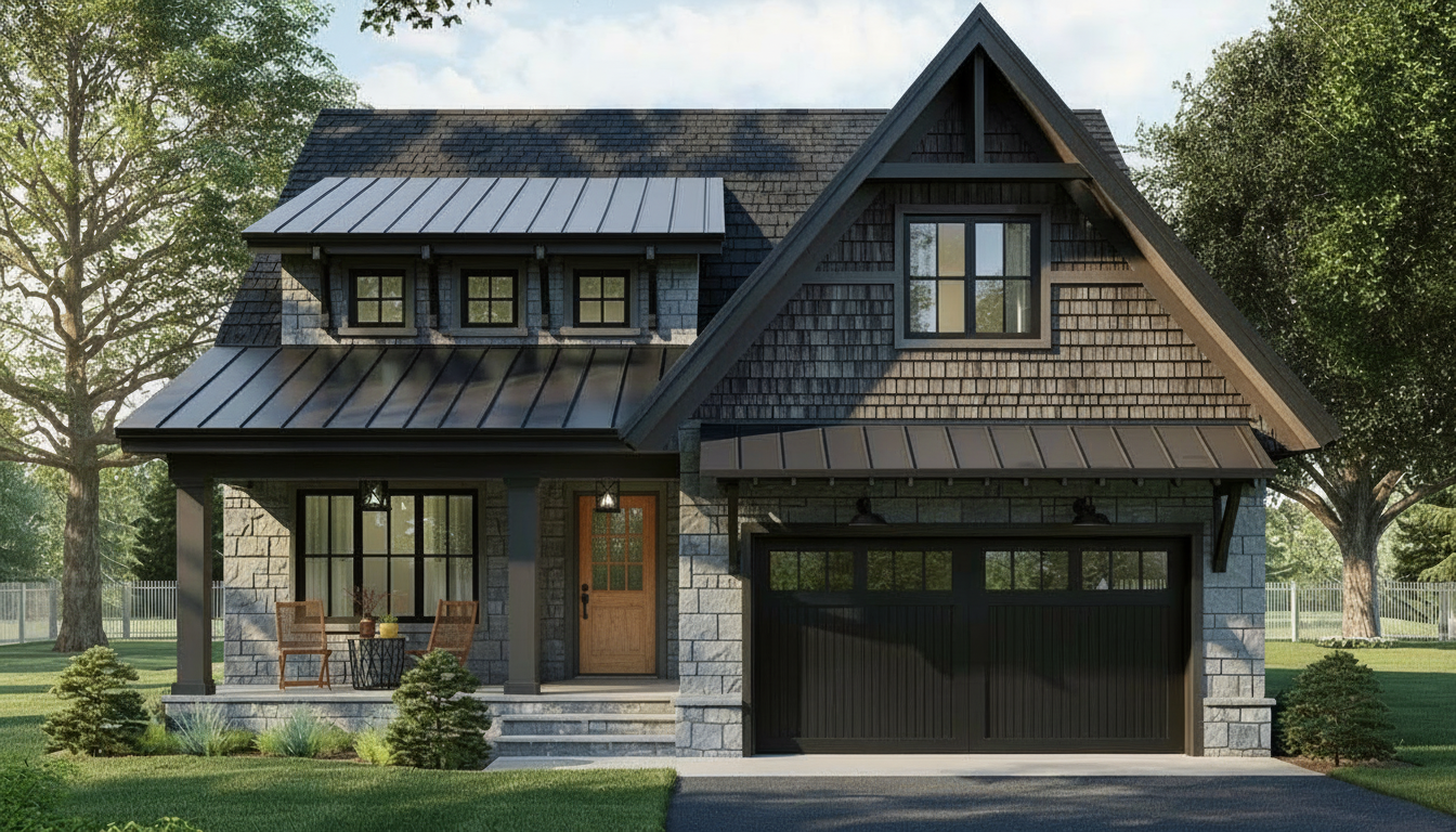 update this home by replacing the stone siding with the charcoal cedar shakes as seen in the gable end please also add black gutters and downspouts