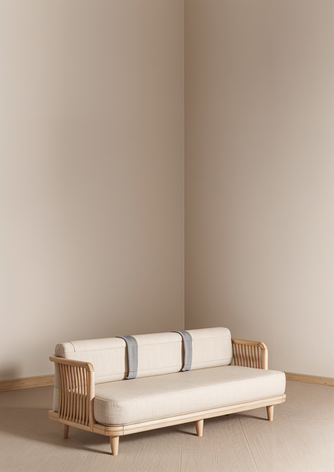 interior shot an interior photograph of a serene minimalist open plan living and dining room the space features matte white painted walls and a matte white ceiling creating a seamless look the floor is matte light toned parquet a single large window is dressed with a light matte fabric curtain filling the room with soft ambient light a prominent green modular sofa is the centerpiece of the living area complemented by a wooden dining table in the dining zone a large scale wooden slat wall panel serves as a feature behind the tv minimalist built in linear track lights are recessed into the ceiling the overall mood is calm airy and sophisticated