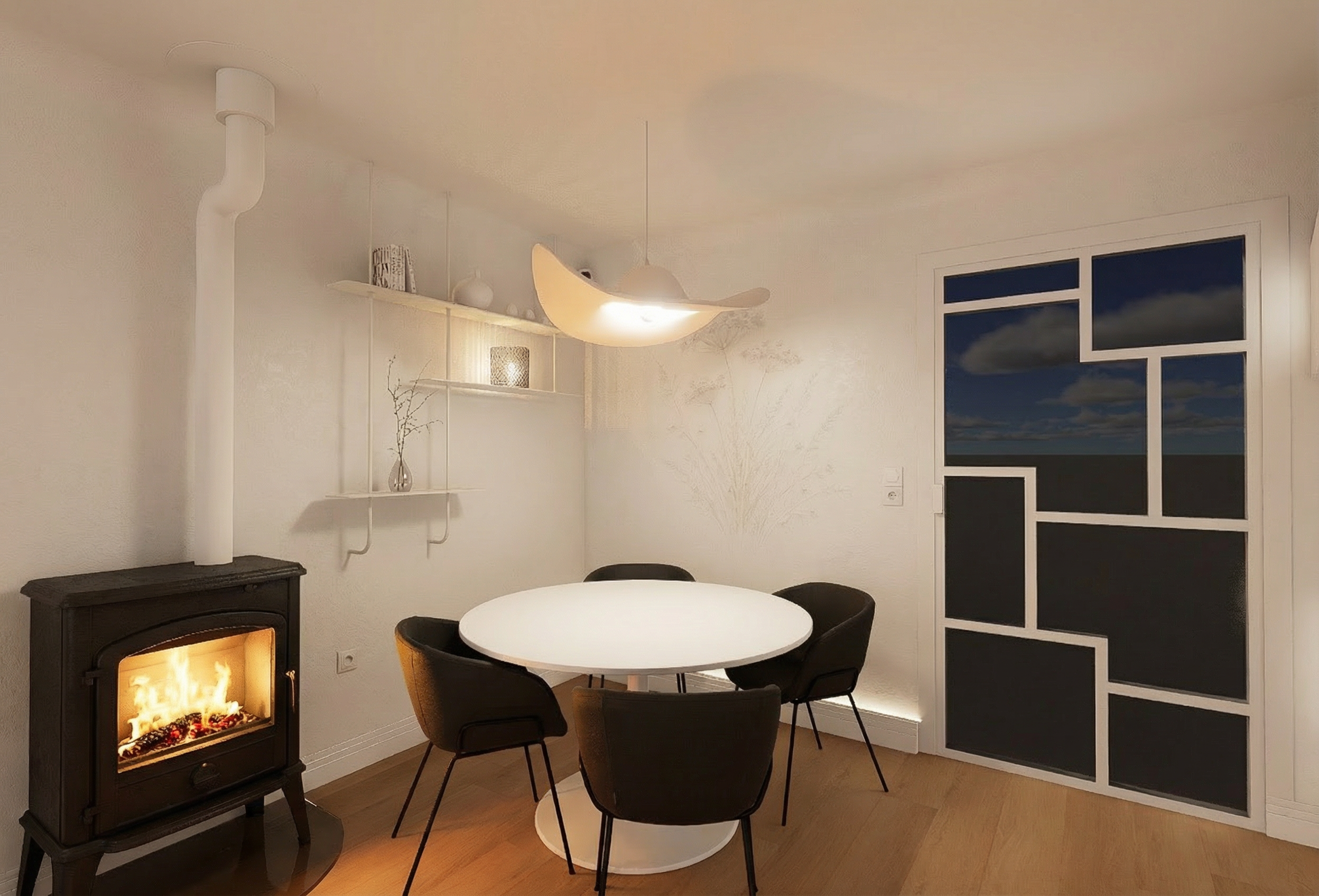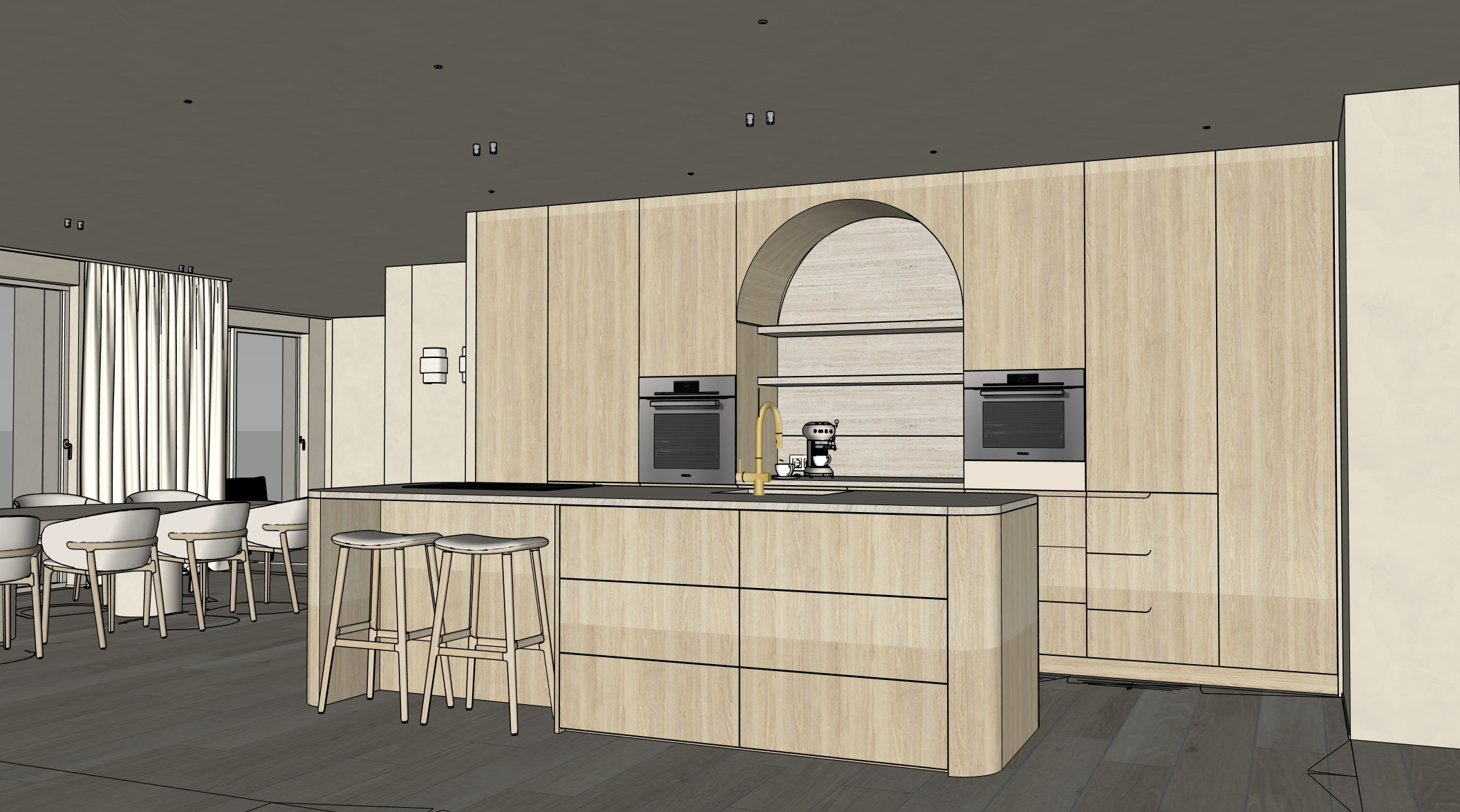 project 1 kitchen dining space strict camera match full scene definition ultra photorealistic pbr only no redesign create an ultra high end 4k ultra photorealistic architectural interior render based strictly on the provided reference image and this exact viewpoint this is an existing interior design the reference image must be treated as a camera matched architectural backplate absolute rules non negotiable no redesign no reinterpretation no repositioning of any element no added or removed objects no style changes no camera change all geometry proportions alignments materials colors furniture placement circulation and architectural volumes must remain 100 identical to the reference image camera image quality absolute lock exact same camera position height and distance same framing and crop same perspective and vanishing points full frame architectural lens feeling 24 28 mm perfect verticals no distortion image quality requirements ultra sharp focus over the entire image no depth of field no blur no haze no fog no bloom crisp edges visible micro detail everywhere architecture spatial layout fixed open kitchen dining space dining table in the foreground left kitchen island in the foreground right full height kitchen wall in light oak veneer central arched niche in the kitchen wall integrated bar cabinet niche with shelves and wine cooler on the left mortex wall volume with arched glass door between dining and kitchen all spatial relations dimensions and alignments must be identical to the reference image floor pietra bicci tiles size 90 90 cm light sand color matte mineral finish subtle stone variation clean grid layout with thin joints correct real world scale no gloss no reflections walls ceiling mortex finish on all walls and ceiling color exactly identical to the reference image walls and ceiling must be the same color family visible hand applied texture subtle movement and depth matte finish not flat not concrete ceiling texture slightly softer but still readable wood critical one single type unilin master oak naturel 0h915 applies to kitchen wall cabinetry kitchen island fronts dining chair legs bar stool frames shelves requirements correct real world grain scale vertical grain on tall cabinetry seamless pbr textures no repetition no mirrored grain satin mat natural lacquer subtle pores and depth no other wood type allowed stone surfaces travertino classico uniceramica used for kitchen island countertop back wall of the arched niche characteristics horizontal natural veining open pores clearly visible matte surface soft mineral reflections no polish no gloss dining table material mortex color identical to walls and ceiling oval tabletop central cylindrical base soft rounded edges matte mineral appearance chairs stools dining chairs legs master oak naturel upholstery beige boucl fabric clearly visible looped texture soft organic shape bar stools frame master oak naturel seat beige boucl fabric texture must be very clearly readable soft padded volume kitchen equipment details ovens miele artline color pearl beige fully integrated flush mounted coffee machine smeg color beige located in the arched niche faucet brushed brass same finish as lighting fixtures handle rail in kitchen wall keep exactly as reference subtle and integrated arched niche fixed feature perfect soft arch geometry back wall travertino classico wooden shelves master oak naturel integrated led under shelves warm neutral light no visible light sources gentle wall wash effect lighting daylight primary soft natural daylight gentle sunlight allowed no harsh sun patches balanced exposure artificial lighting ceiling spots brushed brass minimal refined pendant above dining table sku aba 137 es contain armatur brushed brass led only under shelves warm neutral tone no additional lights no decorative lighting curtains exterior view curtains linen fabric color identical to walls and ceiling clearly visible linen weave semi transparent soft natural folds exterior green rural landscape open fields minimalist countryside view soft horizon no buildings no urban context material realism pbr only critical physically correct pbr materials only correct roughness maps normal micro normal detail real fresnel reflections physically accurate ior materials must clearly react to light no flat surfaces no plastic look render quality ultra photorealistic ultra sharp 4k high sample count clean global illumination crisp shadows sharp reflections no denoiser blur no post processing effects negative prompt mandatory cgi look render look illustration sketch style stylized lighting cinematic lighting dramatic contrast flat lighting wrong colors wrong materials wrong wood type wrong stone wrong proportions concrete look glossy surfaces plastic materials texture tiling repeated textures mirrored grain extra lights hidden leds added furniture removed objects different appliances black ovens camera change zoom crop perspective distortion warped verticals depth of field blur haze fog bloom noise grain people reflections of people clutter game engine look