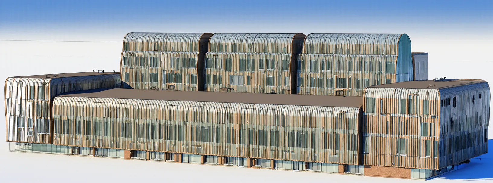 show curved courtyard style driveway from the left side of the image going to the left side of the structure on the right