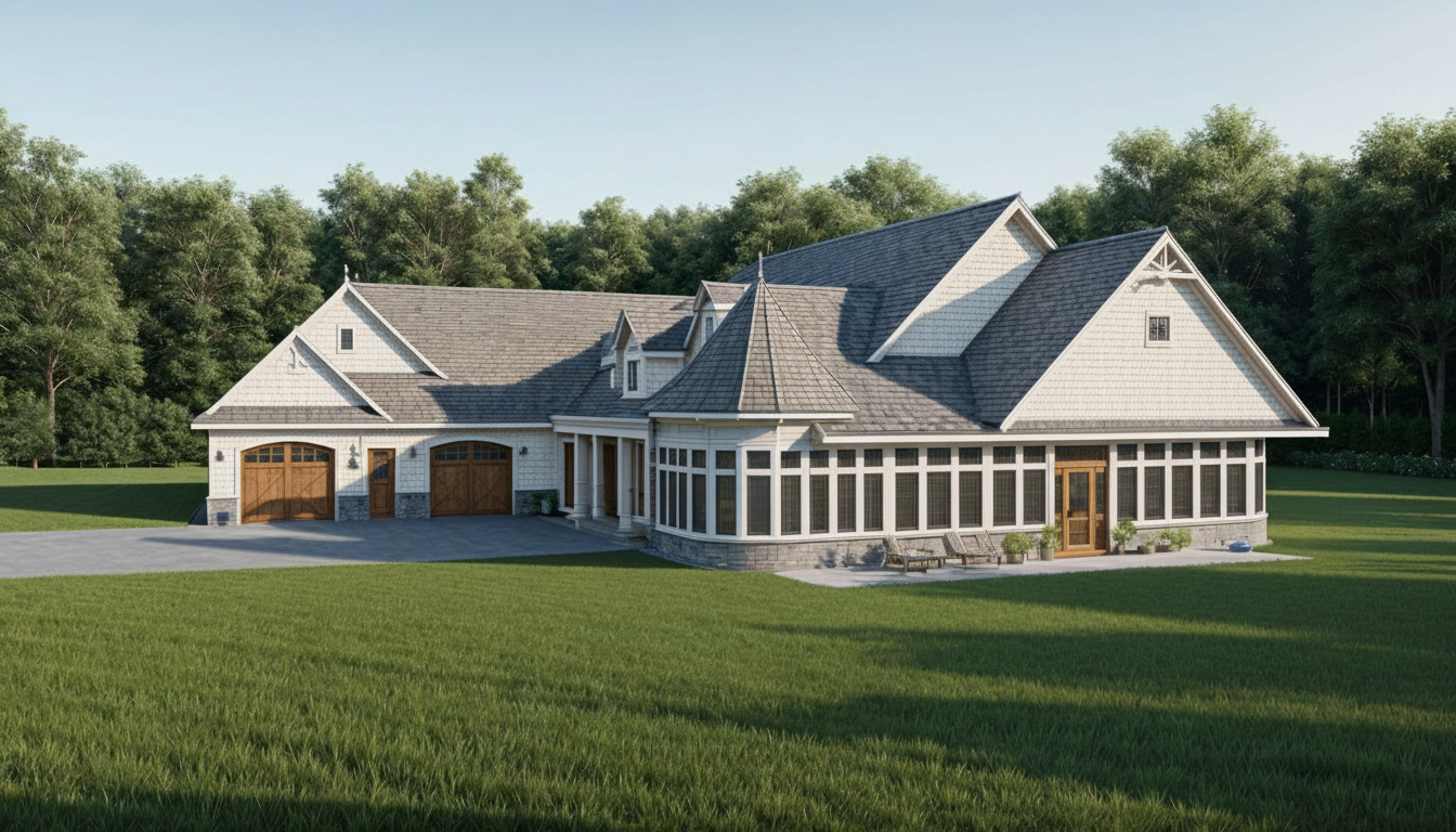 highly detailed 3d architectural rendering of a victorian farmhouse style home new construction designed to look historically authentic exterior features light blue horizontal lap siding as the primary cladding with accent areas of scalloped siding and decorative shake siding in a soft cream off white color the facade includes intricate victorian trimwork ornate fascia boards decorative brackets gingerbread detailing layered crown moldings and patterned gable trim the windows should include traditional divided lites wood frames historically inspired proportions subtle weathered character but still well maintained a highly detailed screened in front porch with elaborate trim decorative corbels turned wood posts ornate balusters intricate fretwork and subtle wrought iron accents integrated into railing details and porch ornamentation the steep gabled rooflines multiple dormers decorative ridge caps and period appropriate architectural symmetry should match the provided image photorealistic materials high resolution textures realistic lighting soft natural daylight architectural visualization ultra detailed 8k professional real estate render cinematic shadows physically accurate materials
