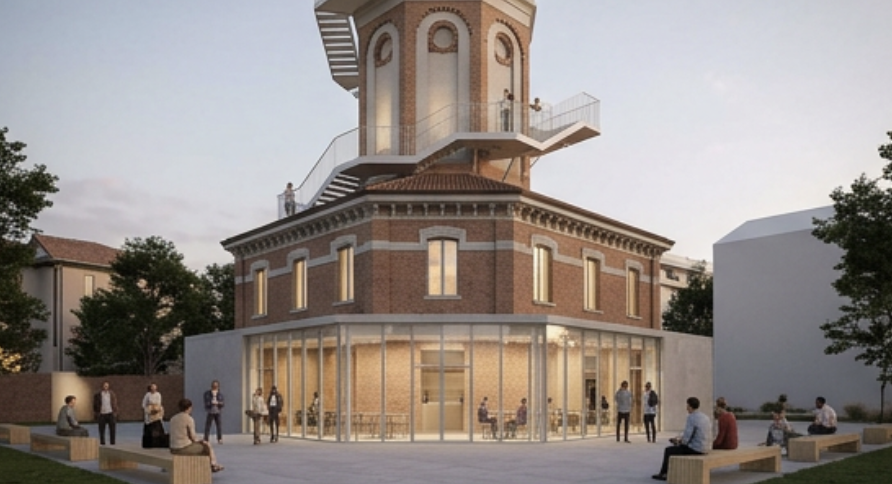 exterior shot add here staircase exterior around the tower to the top reconstruct it a bit and the ground floor glass doors only so it feels open sustainable but new and still preserved history