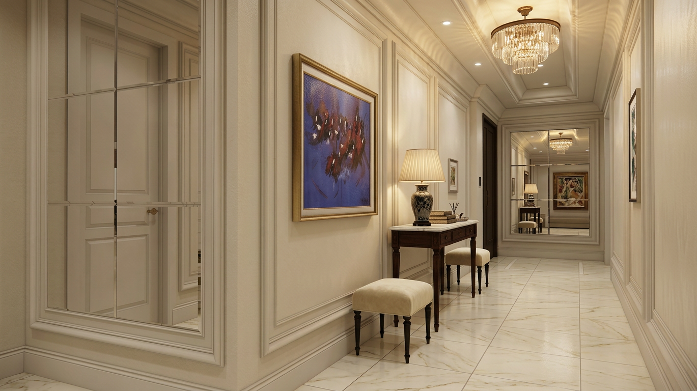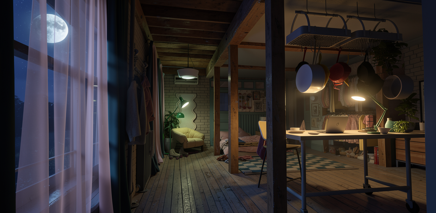 the lighting is cinematic like a movie film set nighttime with cool light coming in from the windows on the left there are light pink sheers over the windows on the left that let the light through and obscure the view outside the exterior world outside the windows is not distinguishable the interior lighting inside the apartment is warm lighting the chair in the back corner is the hem beige puffy lounge chair the lighting should be cinematic the wood floor boards are older the brick is painted a taupe color the wood beams and post are a warm walnut tone with some wear the wood is matte finish