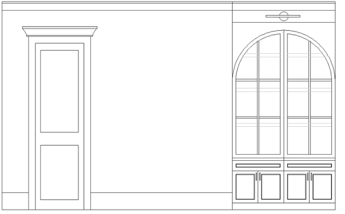 please render this elevation in 3d make the walls ceiling and door on the left dark blue please make the built in cabinet on the right with medium wood stain add desk and chair and add decor on shelves in the built in