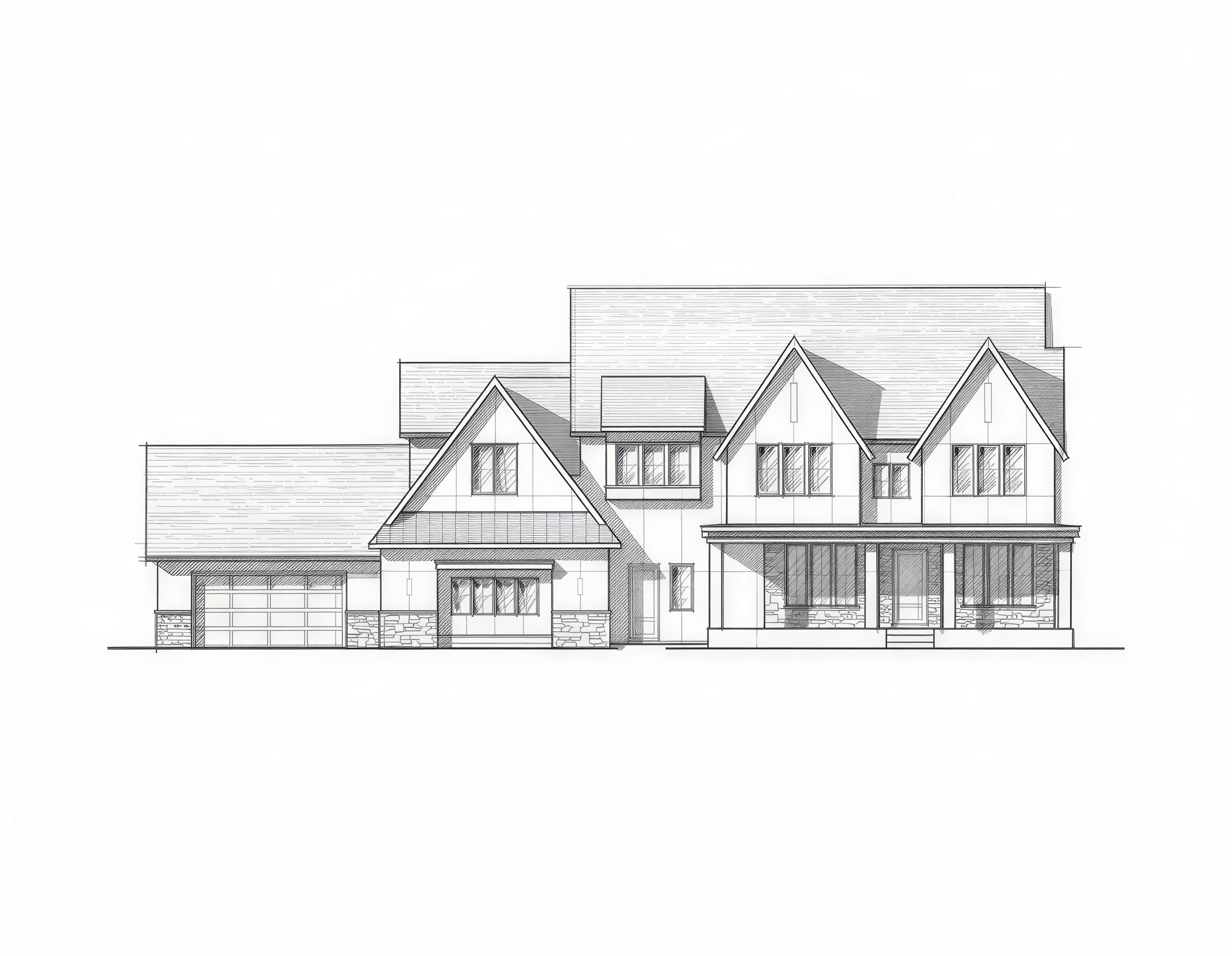 add minimalist 2d line drawing landscaping to this architectural elevation include a mix of deciduous trees small ornamental trees and low shrubs placed naturally around the house use thin hand drawn linework consistent with architectural sketch style no color black gray lines only place taller trees in the background to frame the house and smaller plantings along the foundation add light ground lines grass indication and subtle contouring to suggest terrain without overpowering the architecture maintain clean elevation composition landscaping should enhance scale and context not obscure the building keep all elements in a refined professional architectural illustration style