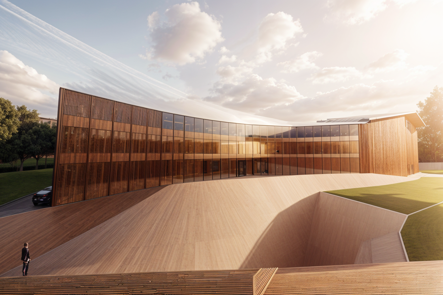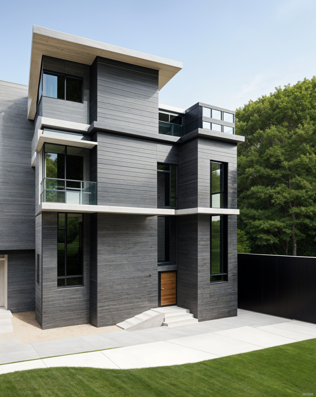 minimalism exterior shot modernist exterior shot visualize a modern residential building with a contemporary design the building should have wooden exterior walls large windows with reflective glass and sleek black accents along the edges the atmosphere should be light and airy with clear blue skies and soft sunlight casting soft shadows the surrounding landscape should include lush green grass colorful flowering shrubs and tall deciduous trees with autumn colored leaves architecture architecture