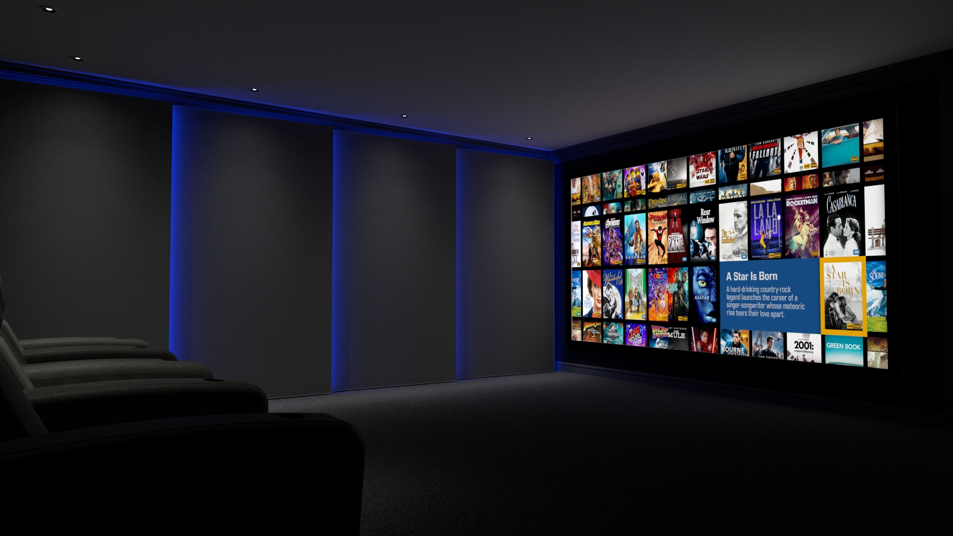 warm the lighting up and add a movie to the screen area also add two rows of cinema seating