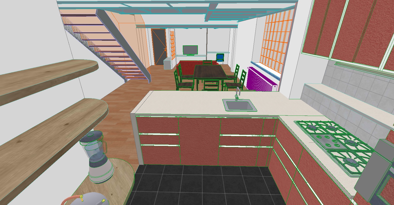 1 g om trie absolument verrouill e tout volume proportion position dimension et perspective doit rester exactement comme sur l image de r f rence cuisine vier plan de travail caissons portes cadres poteau m tallique four r frig rateur radiateur briques carreaux de verre aucun d placement ajout ou suppression escalier marches en bois limon en m tal g om trie verrouill e strictement garde corps m tallique ajout autoris uniquement aucune autre modification salle manger et salon volumes et positions des meubles verrouill s canap dossier visible g om trie strictement respect e meuble tv bureau autoris uniquement un meuble int gr respectant strictement la g om trie existante dimensions conformes l espace poutres apparentes g om trie existante conserv e peinture en noir anthracite autoris e aucun autre l ment ne peut tre ajout supprim ou d plac 2 priorit absolue portes peintes en blanc lisses g om trie inchang e carreaux blancs joints bleus visibles sur toutes les surfaces carrel es four parfaitement repr sent radiateur sous la brique de verre doit rester blanc 3 mat riaux et couleurs secondaires caissons cuisine fa ades en terracotta classique uniformes plan de travail b ton cir tr s clair effet blanc craie cr me poteau m tallique et autres l ments m talliques gris fonc anthracite mat briques carreaux de verre opacifi s et fum s laissant passer uniquement une lumi re naturelle diffuse chaude aucune lumi re directe du soleil ni vue ext rieure poutres noir anthracite meuble tv bureau int gr haute qualit finition soign e respect strict de la g om trie 4 objets et accessoires tag res hautes bocaux uniquement tag res basses 2 machines seulement mixeur et bouilloire plac es correctement aucun objet suppl mentaire sur les meubles de la salle manger et salon 5 clairage 100 lumi re naturelle chaude uniquement diffus e via les briques carreaux de verre aucun clairage artificiel pas de soleil direct ni rayons de lumi re ext rieure 6 restrictions strictes aucune modification ajout ou suppression d l ments sauf les deux exceptions autoris es garde corps m tallique et meuble int gr seules les textures mat riaux et objets list s peuvent tre ajust s aucune forme volume ou d tail suppl mentaire ne doit appara tre 7 orientation et vue vue de l ensemble de la pi ce de vie cuisine salle manger escalier vers l tage salon en arri re plan perspective coh rente sans distorsion dossier du canap visible
