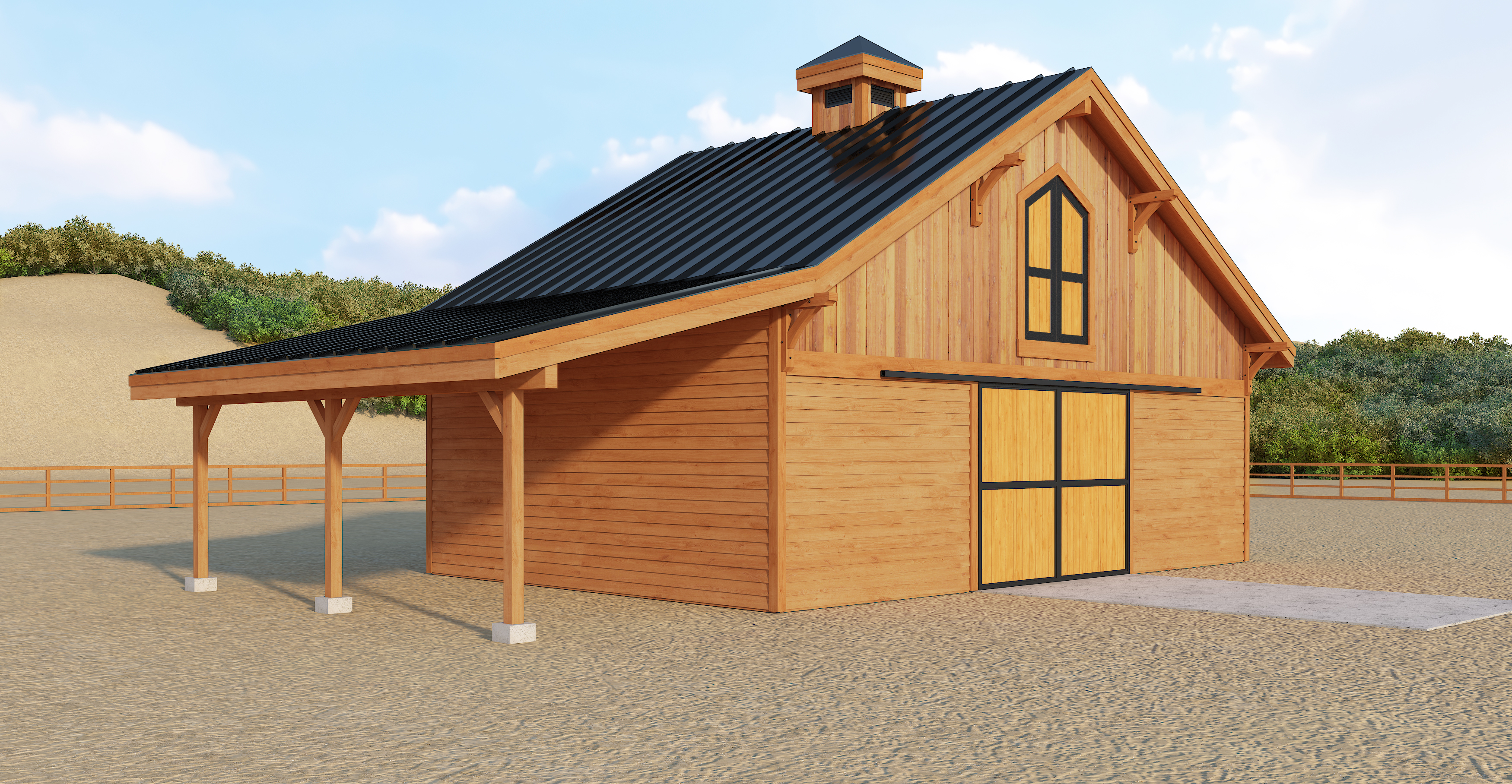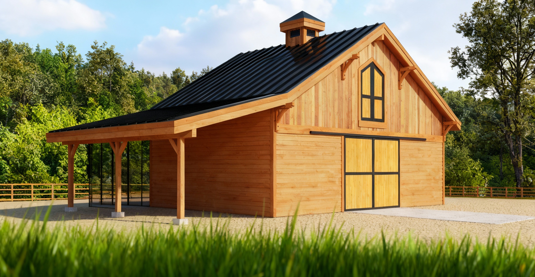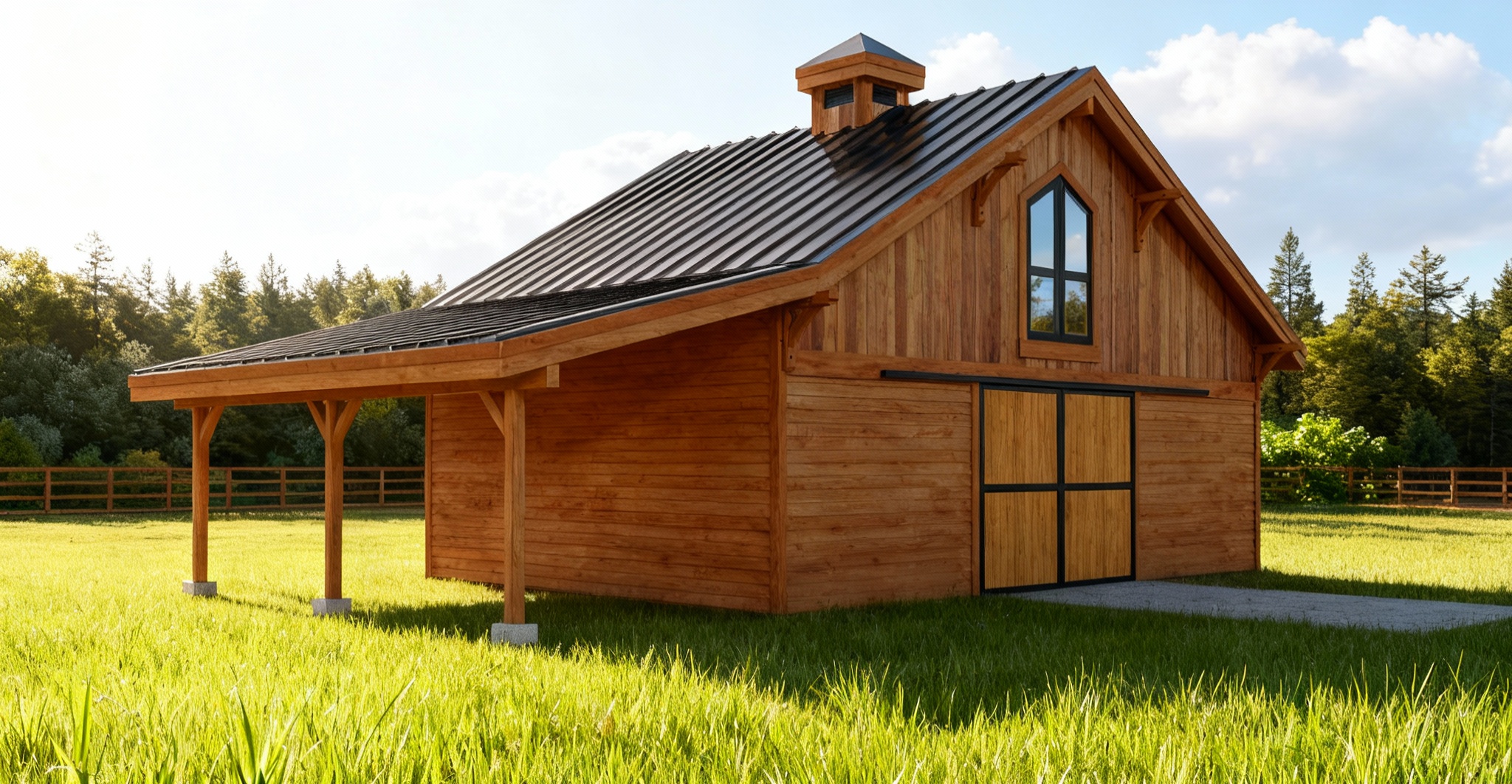 clean timber clad architectural exterior rendered in cinematic bright daylight lighting beautiful clouds in the sky with a hint of blue sky natural cedar wood siding with black trim wood hayloft door with dark trim wood barn doors with black trim black metal standing seam roof grass foreground heavily forest area background lush green and dynamic vegetation landscape natural wood textures high fidelity photorealistic visualization crisp shadow falloff refined fa ade geometry richly detailed grain patterns soft atmospheric depth calm minimal landscaping premium architectural photography mood ultra clean composition and materials reduce vibrancy
