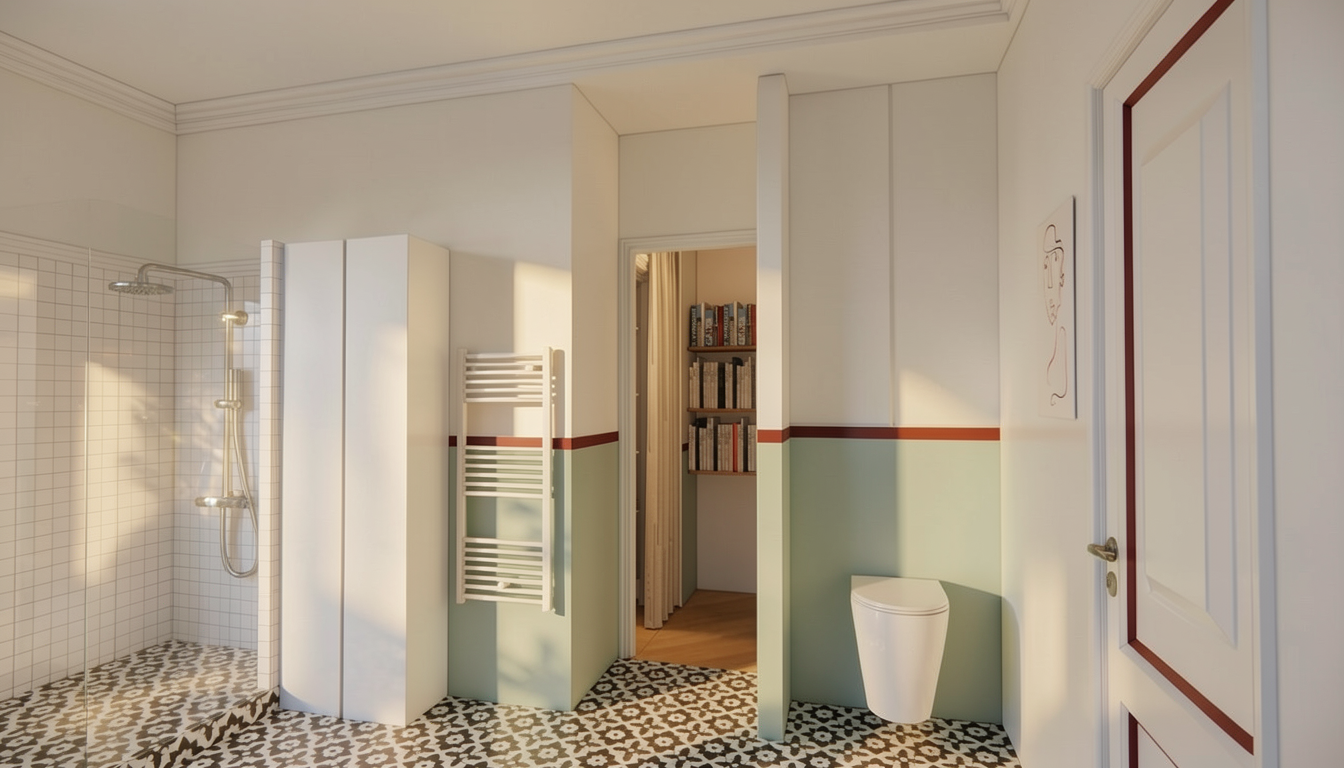 photorealistic interior office space open plan workspace light oak workstations with white steel frames acoustic desk dividers ergonomic black office chairs large floor to ceiling windows with view of green trees natural daylight flooding in from right side soft diffused light from recessed led ceiling panels light beige walls with subtle texture light grey carpet flooring with natural fiber texture large tropical indoor plants in white planters two professionals working at desks desks filled with everyday office items including coffee mugs water bottles notebooks pens sticky notes printed documents small desk lamp phone glasses case headphones resting on desk cable management visible under desk personal items like a small plant or photo frame on corner of desk papers slightly scattered realistic clutter suggesting active workspace warm and calm atmosphere architectural photography shot on canon eos r5 35mm lens slight depth of field subtle film grain physically based rendering ultra sharp details 8k resolution award winning interior design photography