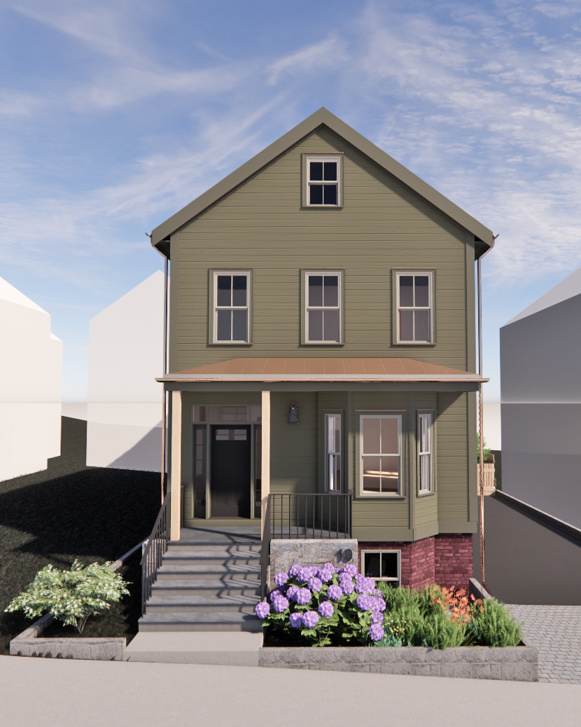 boost the realism of this modern colonial home somerville ma with a clean and professional look maintain the forms of the building pictured without distorting their shapes or perspective enhance the clarity and texture of the muted green wood clapboard facade the grey windows the standing seam copper porch roof the copper gutters the stacked stone porch wall the red brick foundation add realistic lighting effects including soft natural sunlight that highlights the architecture fill in the white forms of surrounding homes additional trees and subtle shadowing from the building and surrounding trees adjust the sky to a bright clear day at golden hour to give a vibrant yet polished atmosphere refine the reflections on the windows to enhance the depth and dimension of the glass making the overall scene look more immersive and lifelike show the trees as changing in color