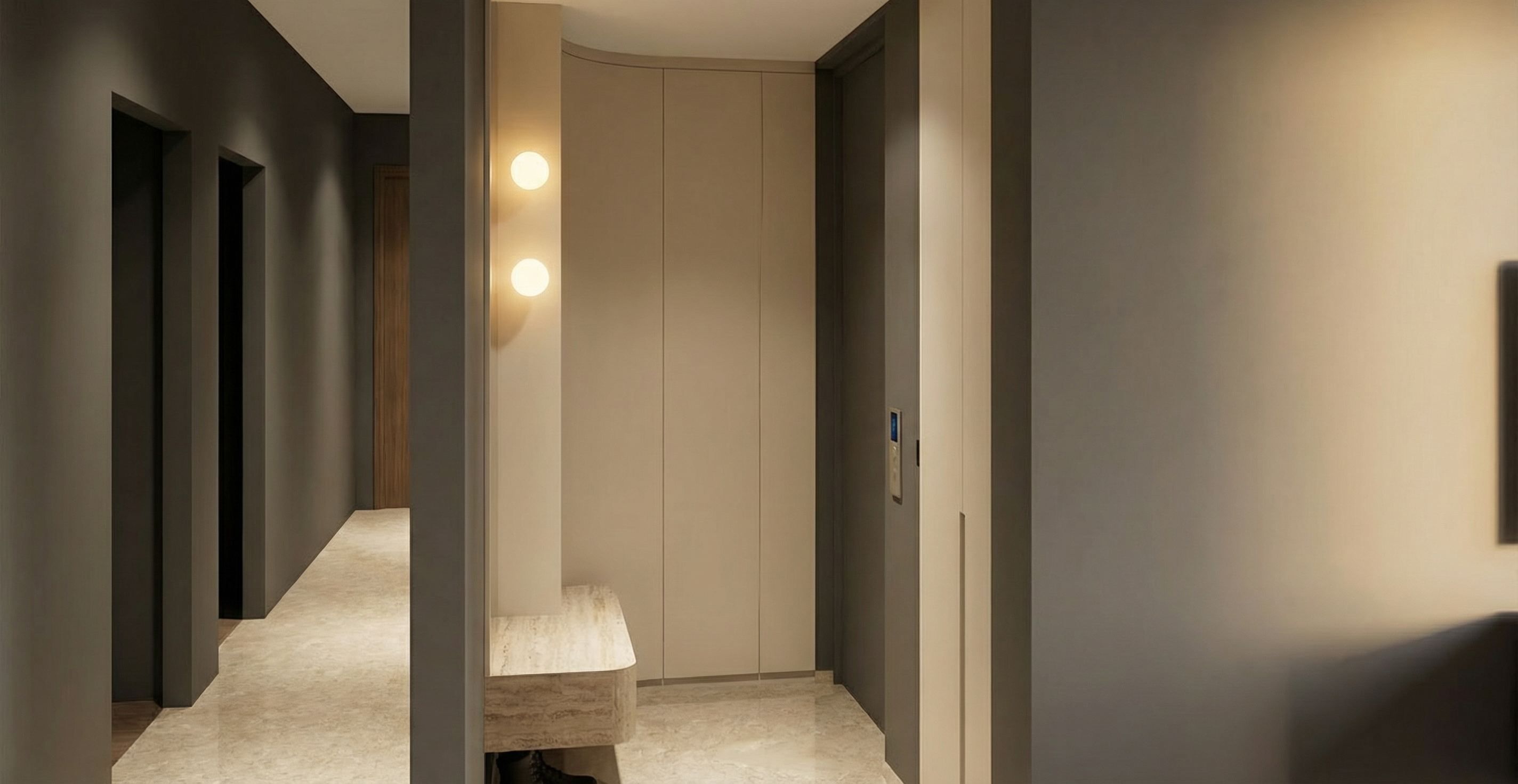 the cabinets are in a light beige solid colour the floor is light beige granite the ceiling is white the spheres are lights the settee is travertine laminate the walls are white