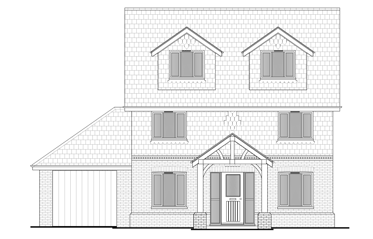a charming two story house with a welcoming oak front porch the exterior walls on ground floor are light brown multi face brick first floor walls are tile hung finish in a dark terracotta hand made clay roof tile the window frames are painted in a contrasting dark grey creating a subtle yet elegant accent the front door is a warm traditional style in black colour the house is nestled amidst lush green shrubs and colorful flowerbeds adding vibrance to the front yard the atmosphere is tranquil and inviting set under a clear blue sky with the gentle warmth of the afternoon sun casting soft shadows on the facade