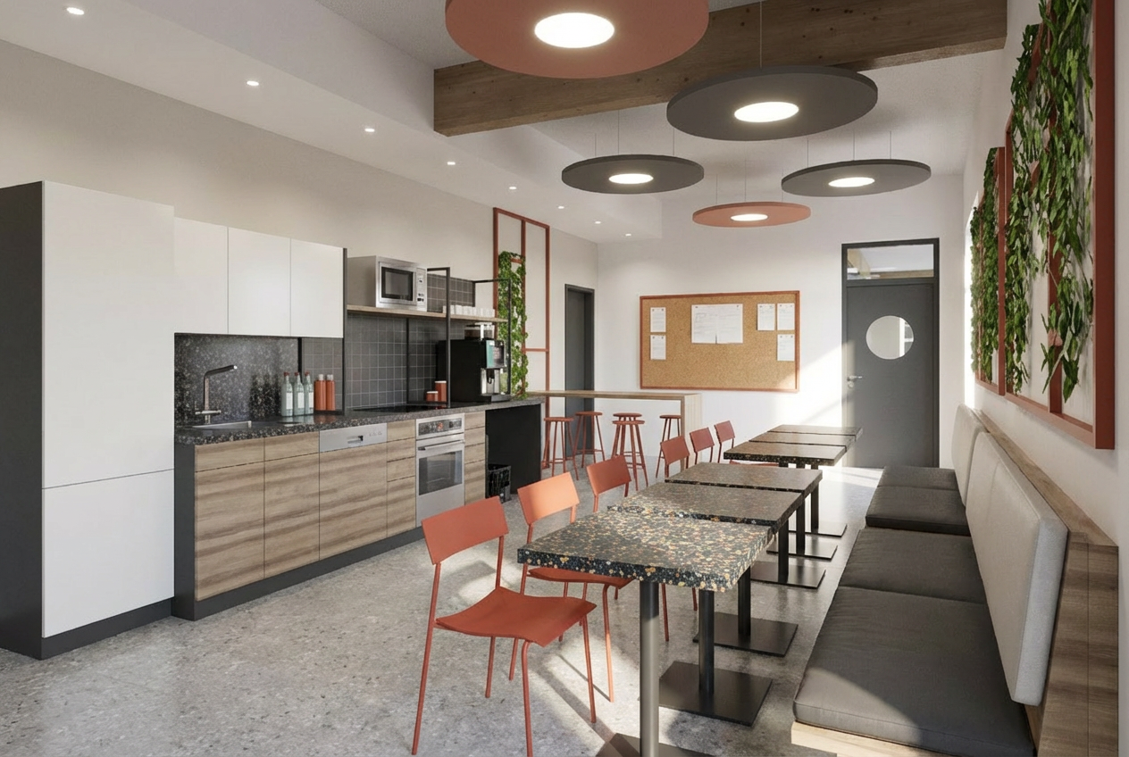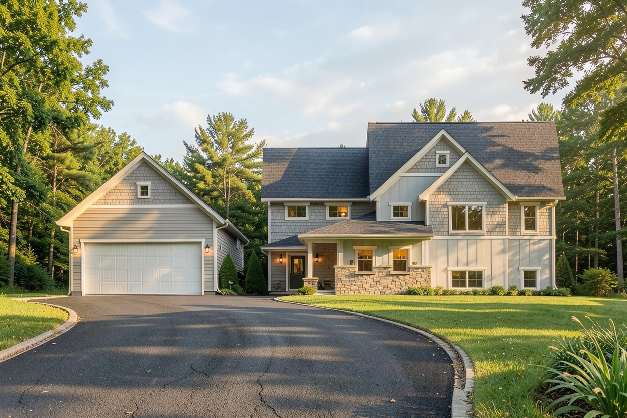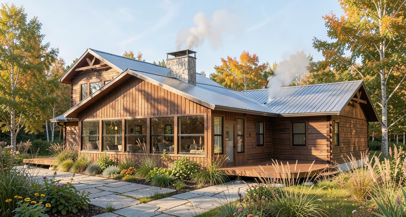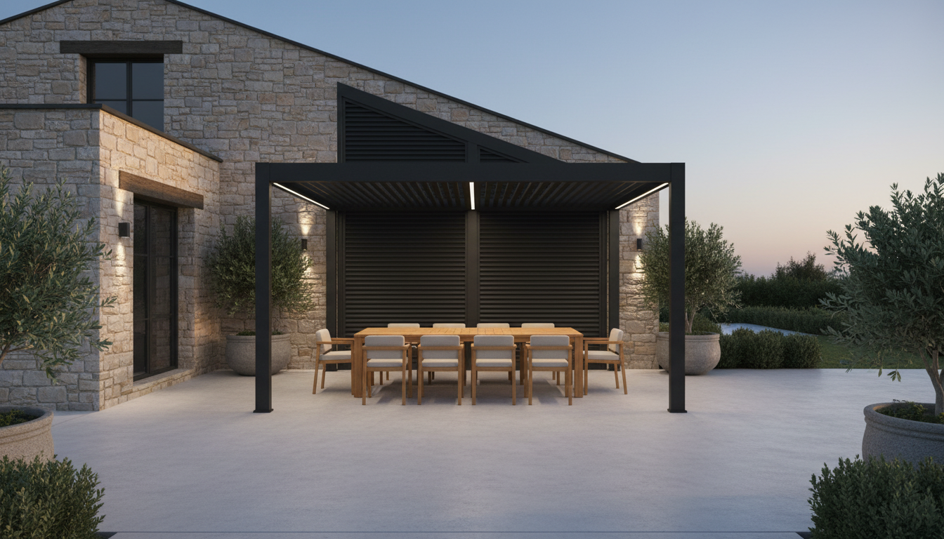 zaha hadid exterior shot create a photorealistic rendering using the uploaded reference images maintain the exact pergola structure and dimensions from the drawing including the four post layout and bay spacing maintain the exact architecture of the existing stone pool house from the photo do not change the building remove all existing patio furniture and clutter so the patio is clean add a modern black motorized louver pergola aligned with the drawing sitting on the concrete patio keep the layout open with only a large dining table centered under the pergola use warm natural materials and soft lighting style modern european outdoor living architectural minimal high end residential architecture