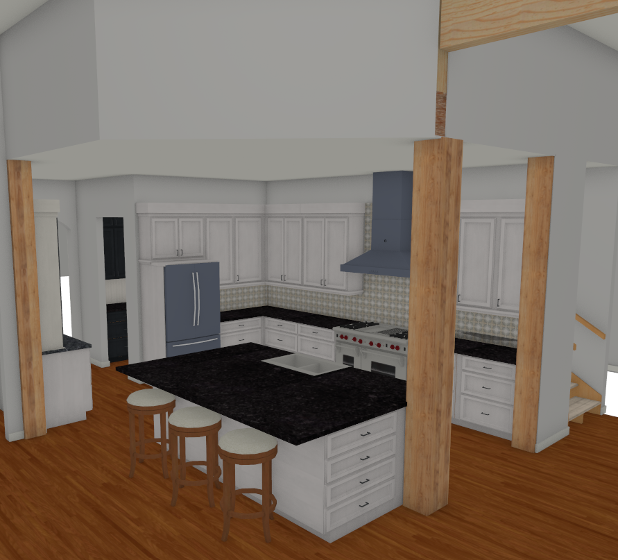 render a cozy and elegant kitchen beams on wall are crafted from rustic aged wood providing a warm contrast the cabinetry is a crisp clean white paired with a black marble countertop giving a touch of sophistication white cabinets with gold handles add an element of luxury the floor is a rich wood set the atmosphere with natural ambient lighting to create a warm and inviting space