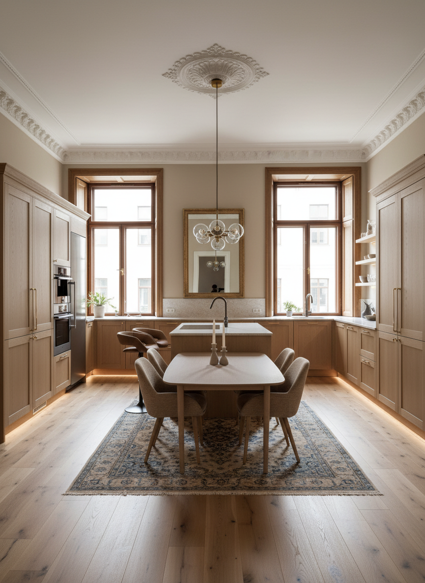 modern dining room elegant minimalist design featuring a long white dining table with matching white chairs soft beige tones for the walls and floor ambient lighting from a geometric chandelier casting warm shadows lush indoor plants adding vibrant green accents by the windows large textured window showcasing a desert landscape with a resilient joshua tree under evening light serene and inviting atmosphere