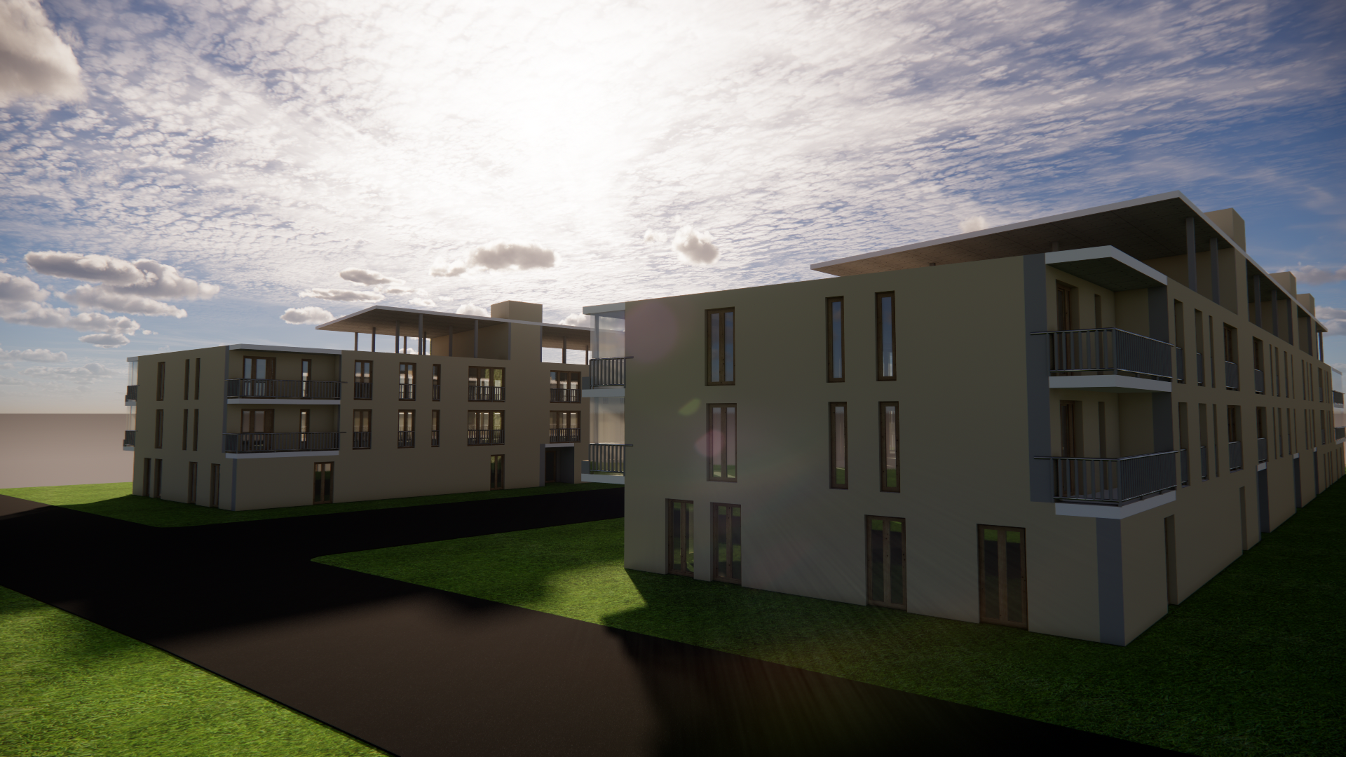make a realistic rendered view while keeping the image setup as in the reference change the wall covering to vertical panels of different sizes in light beige stoneware add solar panels only above the canopy modify the black road into a drivable asphalt road and add trees in the surroundings keep the glass of the greenhouses on the balconies of the first building you see in the photo
