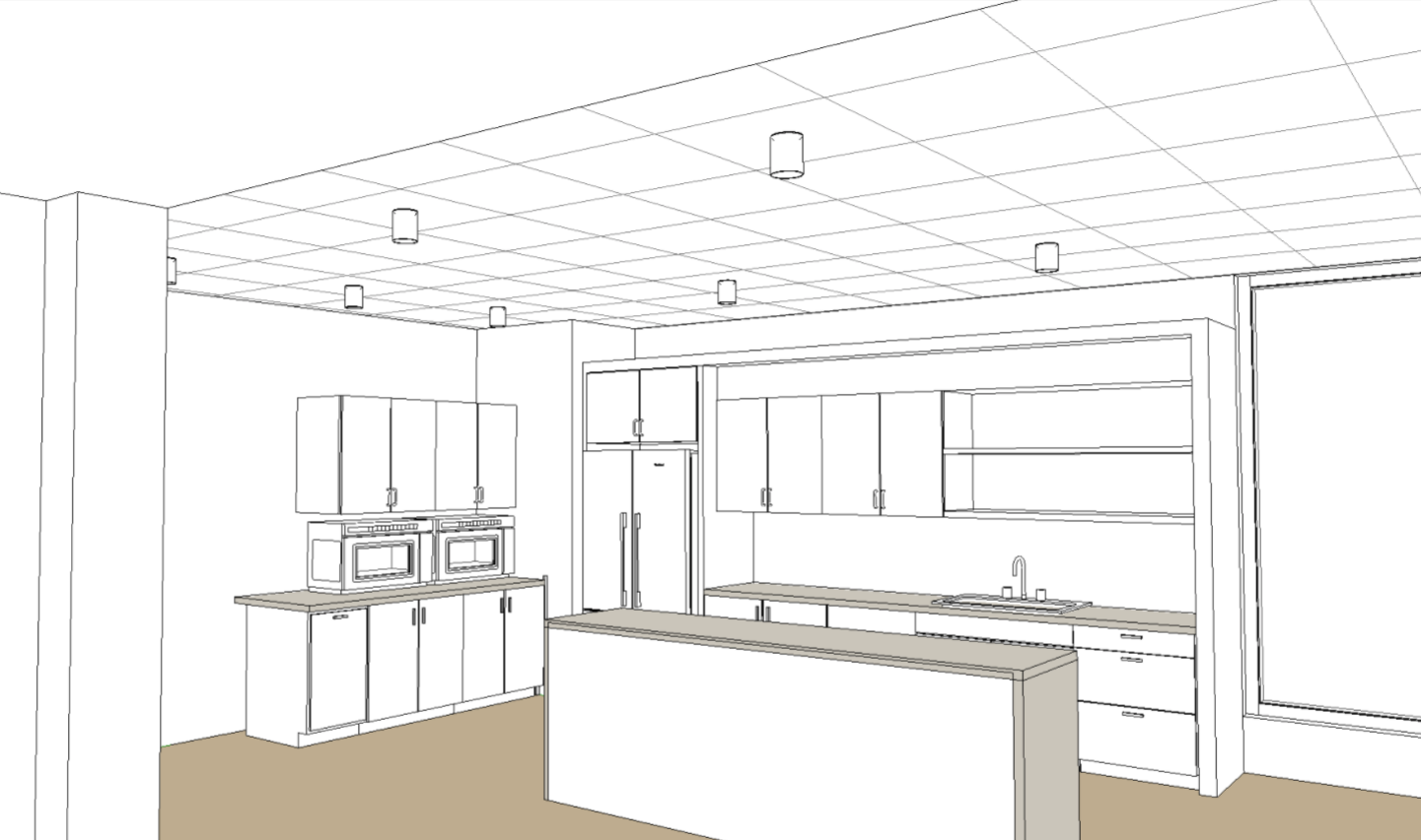 white oak floors white counters walnut base cabinets and very light blue upper cabinets generate a bright rendering