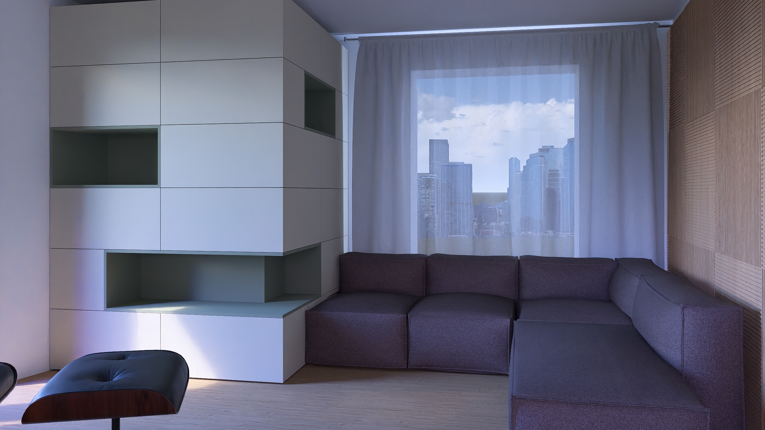 enhance the existing interior rendering into a highly photorealistic modern living room the space should feel contemporary refined and visually rich while remaining clean and well organized show a bright living room a large modern area rug with a subtle geometric or abstract pattern the rug should add texture and warmth without overpowering the space include an abundance of books floor to ceiling bookshelves neatly stacked books on coffee tables and curated piles on sideboards the books should feel natural and lived in with varied colors sizes and slight imperfections to increase realism use soft natural daylight entering through large windows creating realistic shadows gentle reflections on the parquet floor and subtle ambient occlusion in corners materials should appear highly detailed soft fabric texture on the sofa matte and glossy contrasts realistic depth of field and accurate light bounce