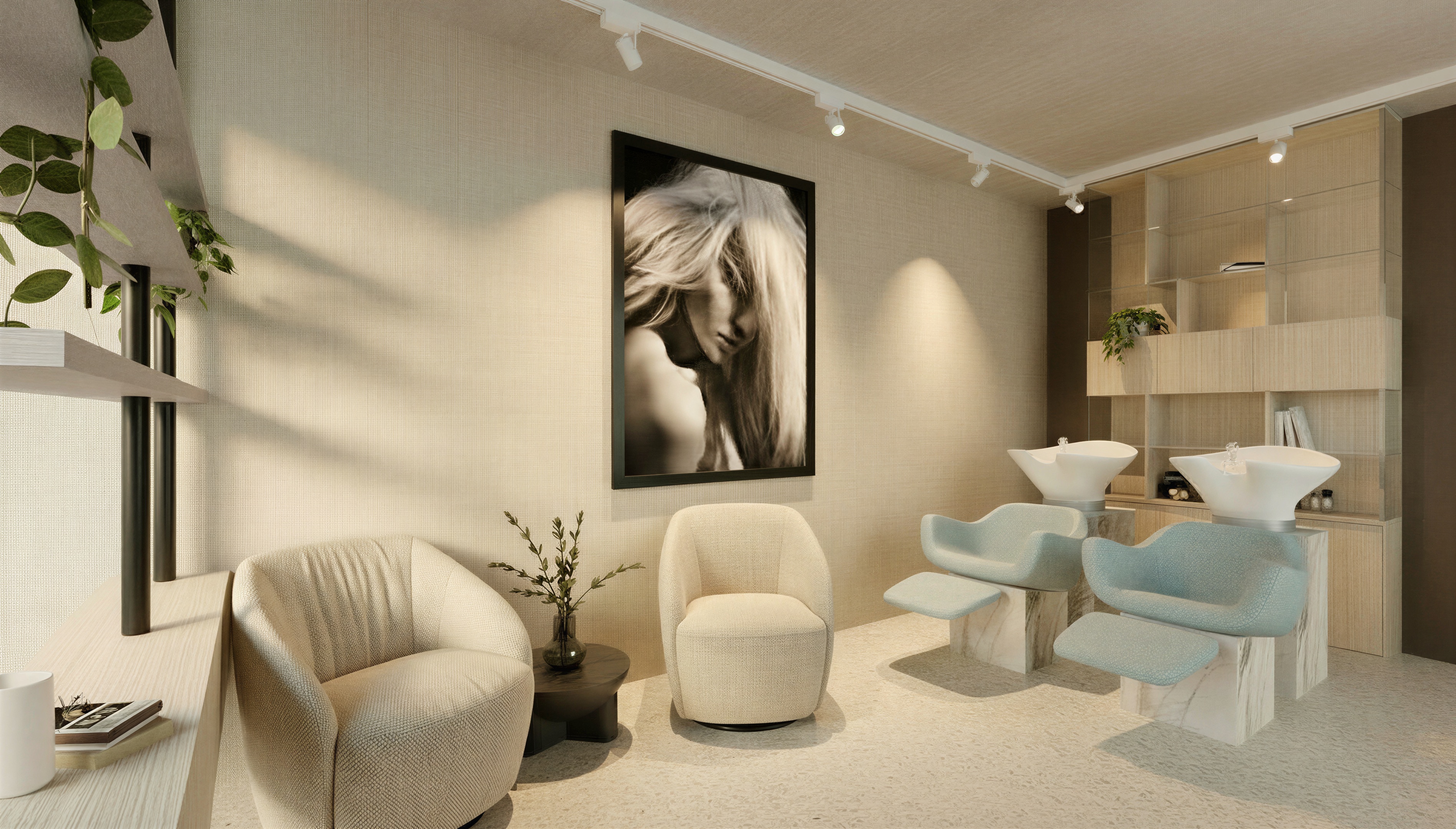 a photorealistic high resolution interior rendering of the upscale salon lounge and washing station maintaining the exact perspective furniture arrangement and all objects the distinct light beige textured wall remains on the left but the entire ceiling is replaced with a smooth light grey polished concrete finish featuring a clean lineless texture the floor is covered in a beautiful high quality light beige vanilla colored terrazzo finish with a fine detailed chip pattern